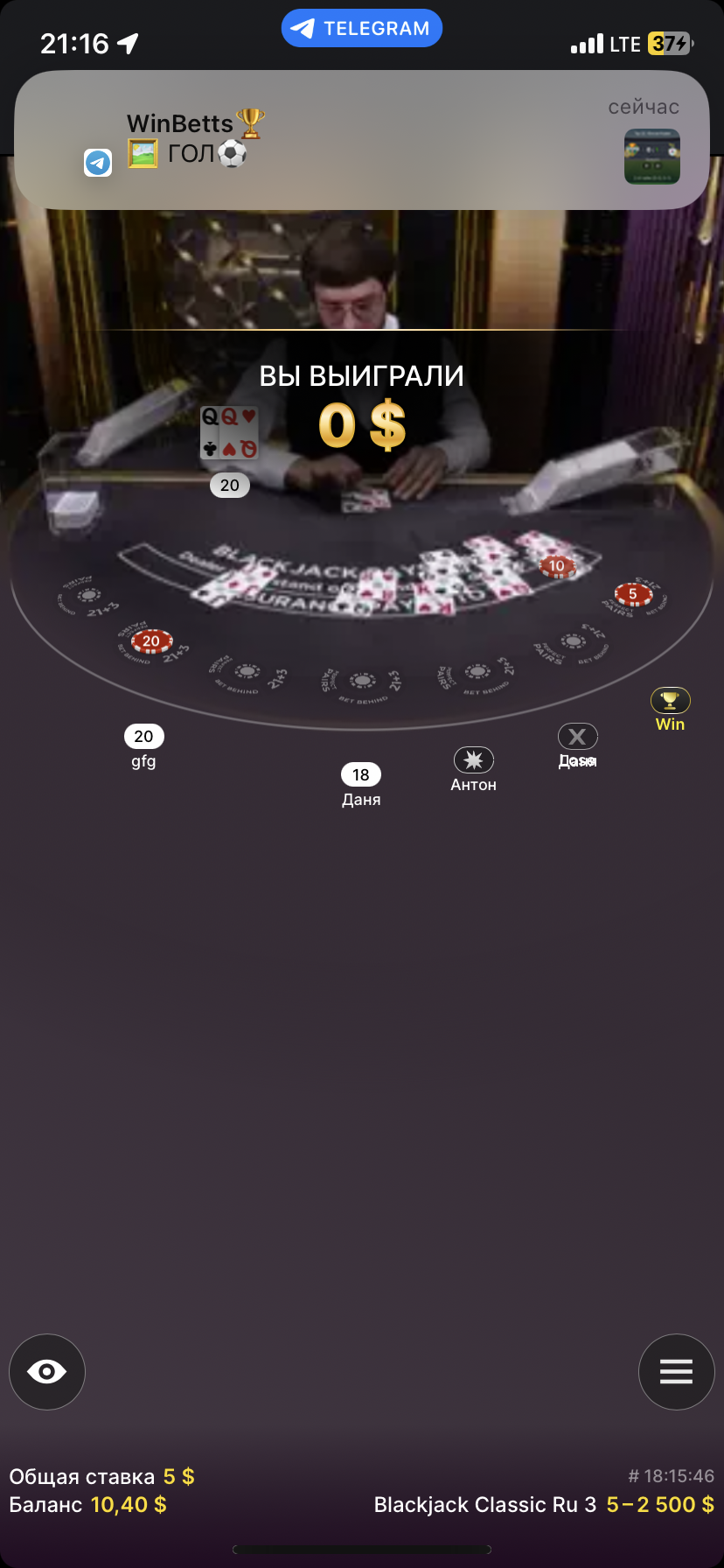 Я решил попробовать раскрутиться с лоу балика, и для этого я выбрал режим Blackjack Live. Первая рука была сложноватой — у дилера, по классике, открытая карта десять, у меня же 13. Каким-то чудом я добрал восьмёрку, и сумма была 21, и при вскрытии карты дилера у него оказалось 20. Соответственно, у меня больше, и я победил. Но вместо положенной выплаты 2 к 1, я получил выигрыш в 0$.