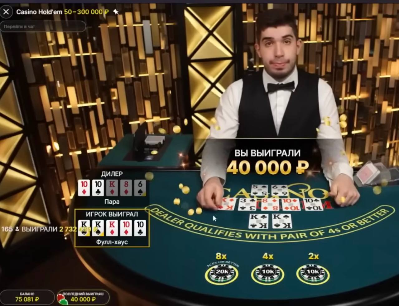 С первой ставки я поставил на бонус и на игру по 2500 (решил начать с небольших ставок). Дилер раздает мне пару королей, и на флопе падает ещё один король. Я очень надеялся, что даст 4, но только 3. После этого на терне и ривере он достает две десятки. Если бы он вытащил их вместо тройки и восьмёрки, мой выигрыш был бы намного больше.