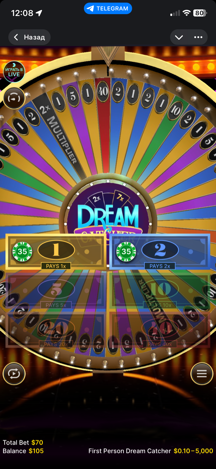 Пошёл в Dream Catcher и начал думать, как же распределить ставки, чтобы риск был минииальным, а поднять что-то смог попытаться. Сначала ставил как попало, а потом решил ставить по 35$ на единичку и двойку, чтобы единица ставку окупала, а двойка плюсовала. К тому же, если выпадет мультипликатор, шанс поймать эти два сектора огромный.