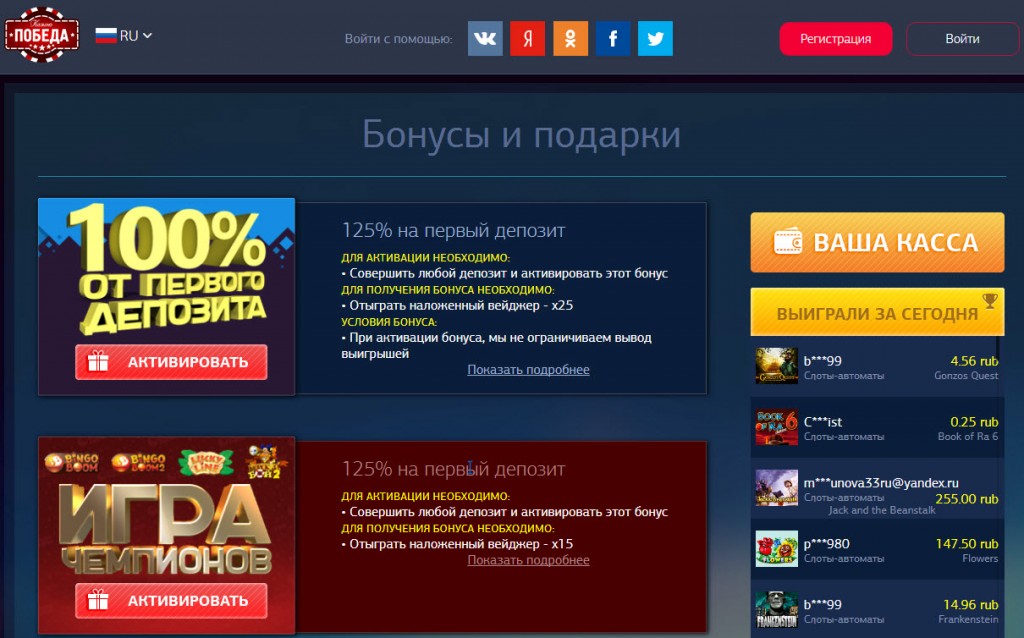 100, 200, 300, 400 или 500 бонусных рублей без депозита в казино Победа для форумчан