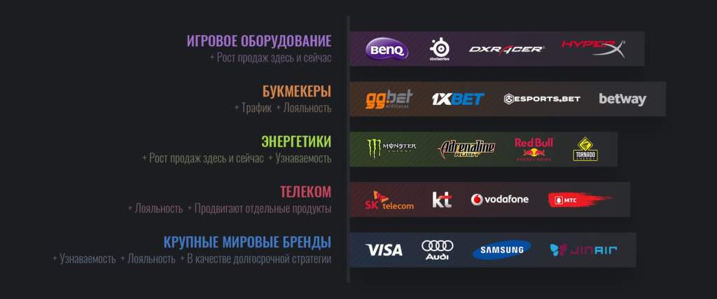 Но, чтобы показать насколько различны бренды, что инвестируют средства в киберспорт, перечислим самые известные, чьи логотипы красовались на футболках участников или на рекламных площадках киберспортивных арен: Coca-Cola, MasterCard, Aviasales, Snickers, Red Bull, USM Holdings, Strong Bow, МегаФон и это далеко не все.