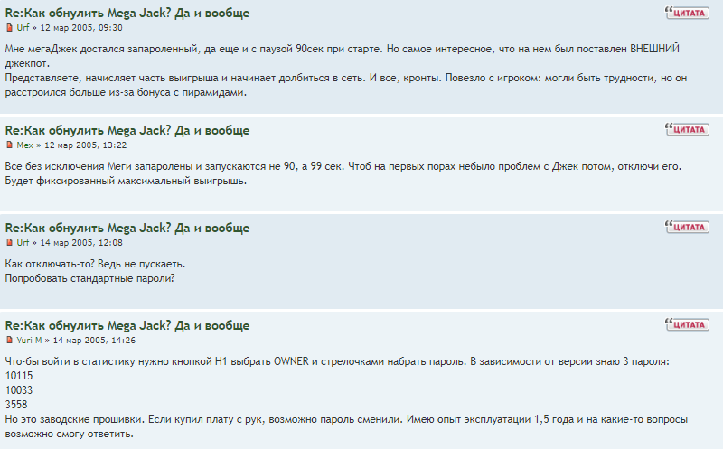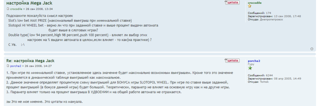 Тут хочется вспомнить слоты MegaJack (те самые, что с Пирамидами, Шампанским, Покером на несколько колод). Так вот они успешно настраивались владельцами самостоятельно. Даже на тематических форумах можно встретить переписки 10-15-тилетней давности, где обсуждалось, как настраивать автоматы болгарского производителя. Вот пара скринов с таких площадок.