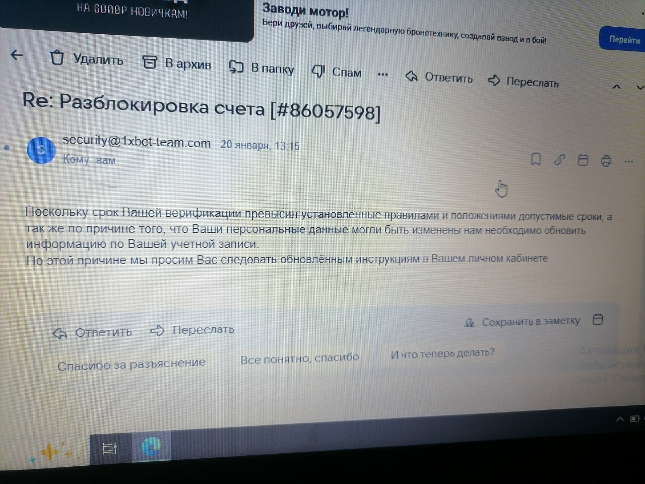 @nightlovell95 Еще ко всему этому хочу добавить, что многих переписок и их запросов не могу найти по причине того, что их система даже не отправляла мне на почту дальнейшие инструкции, о чем я их многократно уведомлял и в ответ получал шаблонный ответ. Вместо этого мне приходилось лично мониторить личный кабинет 1хбет каждый раз со след. инструкциями.