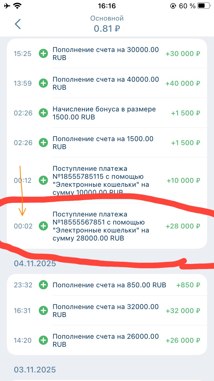 Здравствуйте, дата пополнения 07.11.2025 время пополнения 00:02 сумма 28000 руб