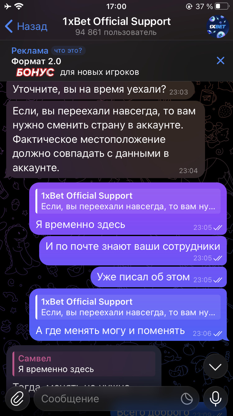 Ну вы прописали обычные шаблонные текста что и мне стало понятно после того как в не получил бонус. Но в самом правилах данной акции отсутствует данные правила которые вы сейчас отписали здесь, в самих правилах как мы все видим указанно в пятницу с 00:00 по 23:59 соотвено я исходя из данных правил вносил депозит в 00:02 в пятницу у меня. Так же хочу подчеркнуть что если бы мне сменили номер и город данной проблемы не было бы, инициатива не смена региона и номера была не моей инициативой, ваши коллеги сами так отписали учитывая что я подтвердил свое отсутствия в Москве и предоставил необходимые документы, иза чего и я не получил бонус учитывая все эти нюансы которые сложились на вашей стороне вы не собираетесь бонусные деньги зачислять? Я как бы со своей стороны все корректно и правильно выполнял. Так же диалог создавался на основании ваших коллег о том временно ли я покинул Москву на что я ответил временно но слово временно тоже подразумевается большим сроком, а если бы ещё 20 числа когда я обращался по почте мне бы сменили хотябы регион вместо номера то я бы получил бонус, но мне не сменили не номер не регион сказав что нет технической возможности вот скриншот. И ещё хочу вам напомнить как раз таки страна регистрации у меня была изначально узбекистан, потом по прибитью в Москву я менял номер телефона на российский оператора но не страну так как в Москве тоже я бываю временно. Суть в том что вы же прекрасно видите что я внёс 00:02 сумма депозита тоже соответствует условиям мои обращения ещё за 2 недели до бонуса тоже соответствуют что я по правилам всегда все выполняю. И уверен ещё в одном что вы в будущем в данном акции в правила добавите слово мск и часовой пояс так как в других акциях в правилах именно так вы прописываетесь правила а в данной акции лишь слово пятница и время. Люди те которые получается улетают меняют место положения даже временно они лишаются бонусов иза того что в правилах нету информации правильной. В моем случаи вы прекрасно видите. И с вашей стороны очень не красиво относится так к такому активному игроку как я с очень высокими параметрами будь здравомыслящий компания с адекватными руководителями без сомнения выдали бы мне бонус который по сути я заслужил всеми своими действиями к тому же ещё и содействую вам в развитии и улучшения вашей платформы а в ответ от вас вижу лишь то что вы в очередной раз готовы лишить игрока на какие то бонусные 28000 которые еще нужно отыграть и ради такого бонуса потерять активного игрока и призвать в нем разочарования и доверия. Скажите ваша компания собирается начислять данный бонус ? Ошибка как в правилах так и в отношении коллег ваших. На моей стороне нету ошибки я всячески все четко выполнял и обращался на почты и в чаты но не кто не чего не решил иза чего по следующие бонусы мне не были зачислены.