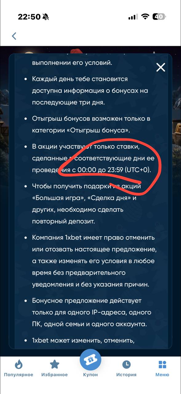 Очень интересно получается, в правилах в условиях выполнения отсутствует часовой пояс и московское время, иза чего я не получаю бонус. Представитель так и не дает конкретного ответа почему в правилах нету данной информации по которой игроки могут не получить бонус, а после вовсе не признают и не пытаются решить. В каждой акции которая у них есть четко ясно прописано акция действует по Московскому времени и указан часовой пояс UTC но именно в данной акции счастливая пятница где я не получил бонус отсутствуют данные условия соотвенно я выполняю условия в пятницу по своему дню вношу депозиты на протяжении недели дожидаюсь 00:02 время как календарь становится пятницей вношу 28000 и не получаю бонус, обращаюсь в поддержку пишут нужно вносить по Московскому времени задаю вопрос почему в правилах условии акции данная информация отсутствует не кто не может ответить и решить.