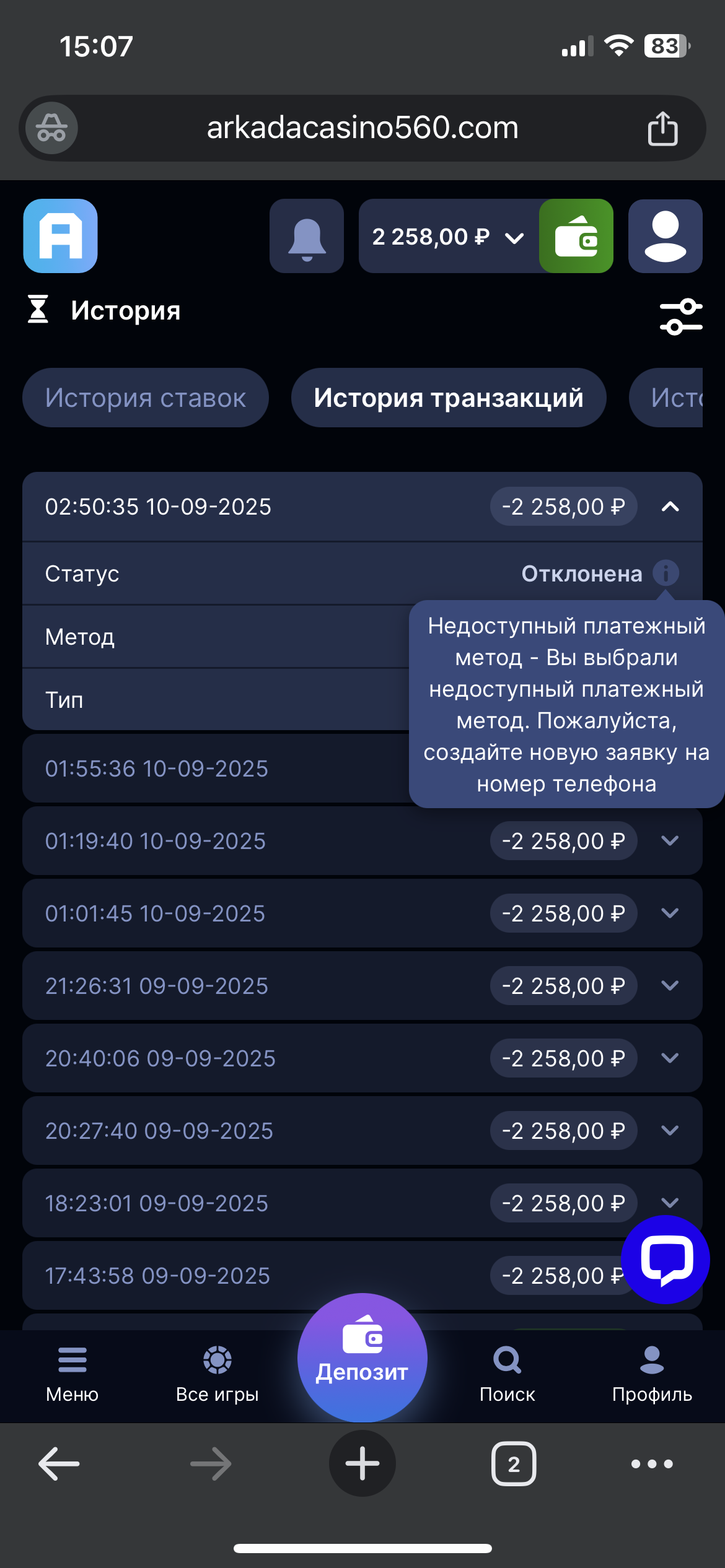 Arcada Casino: 10.09.2025 заблокировали аккаунт на 2258 RUB