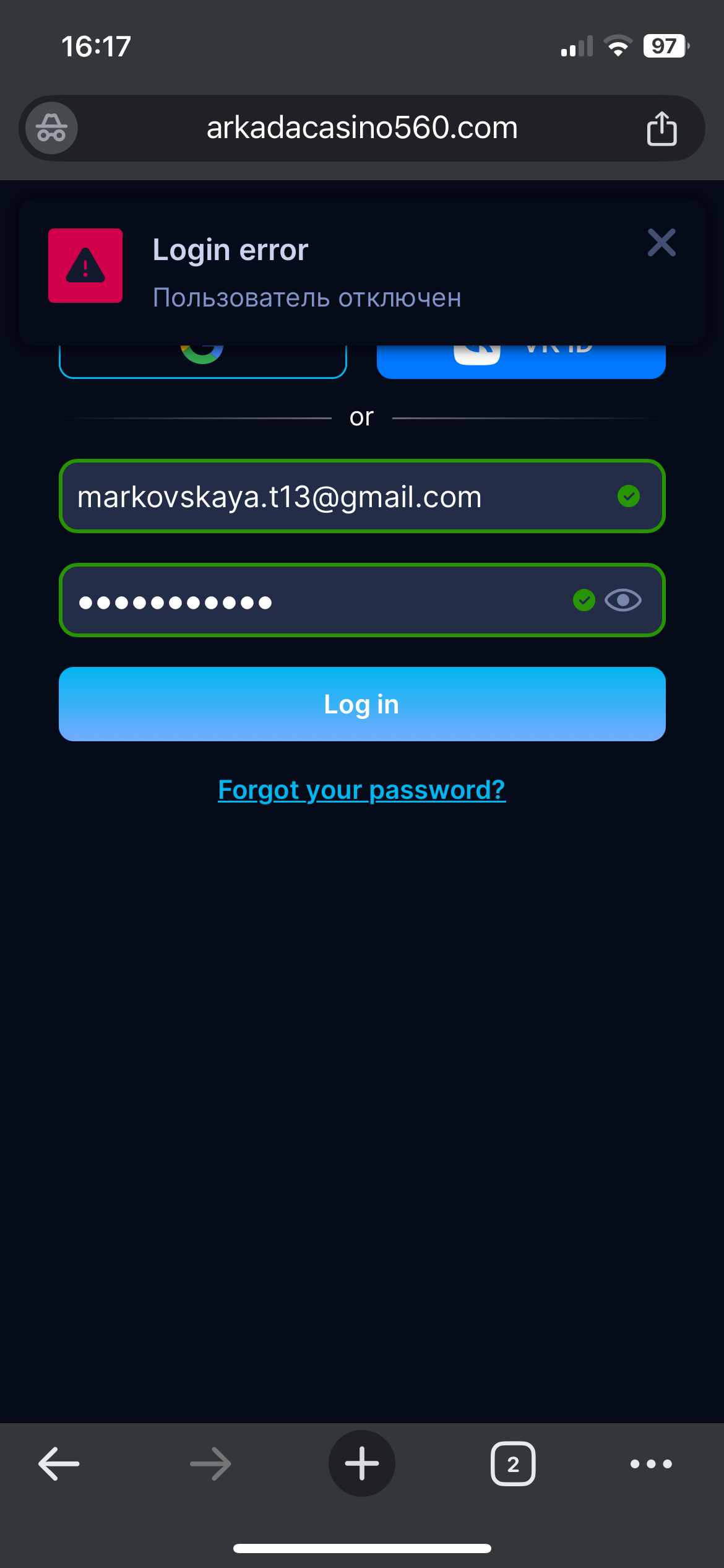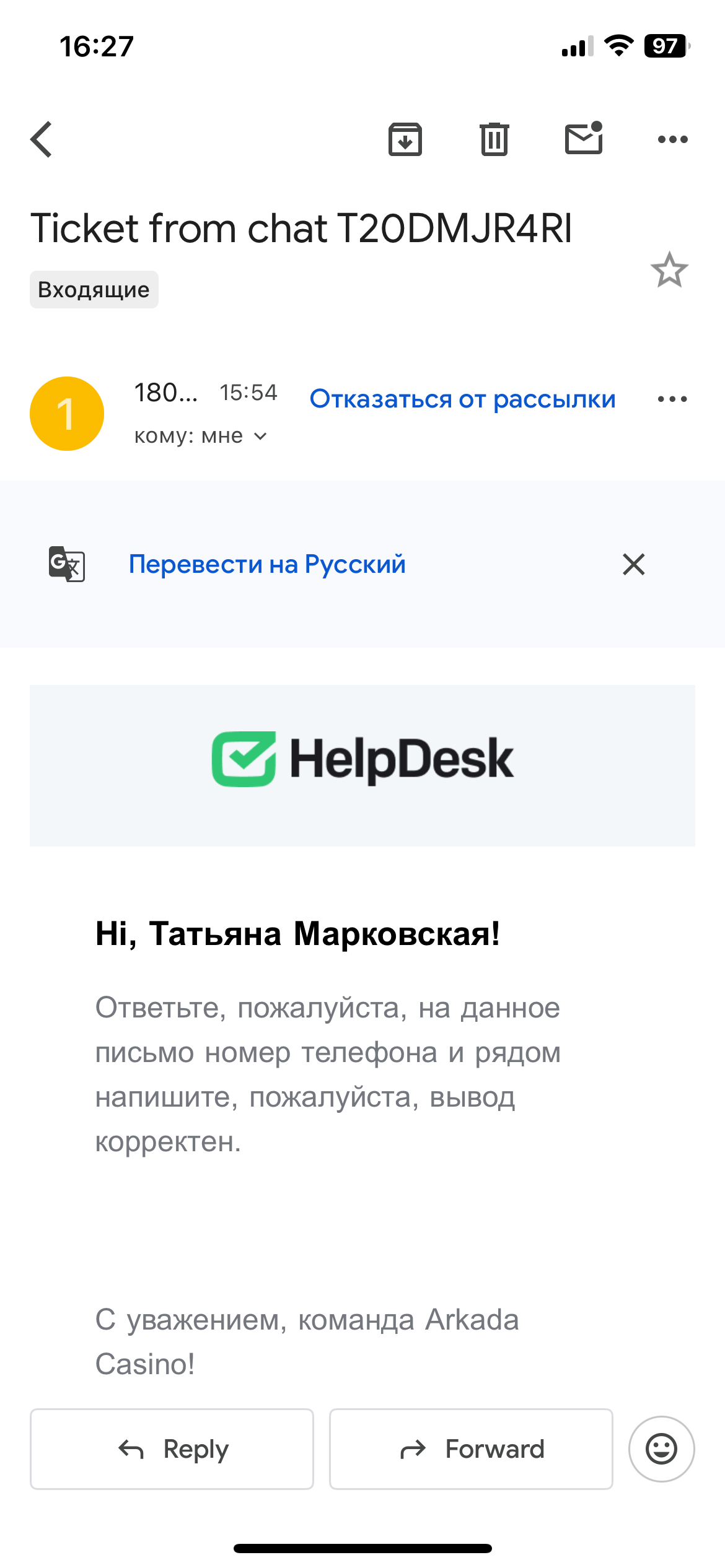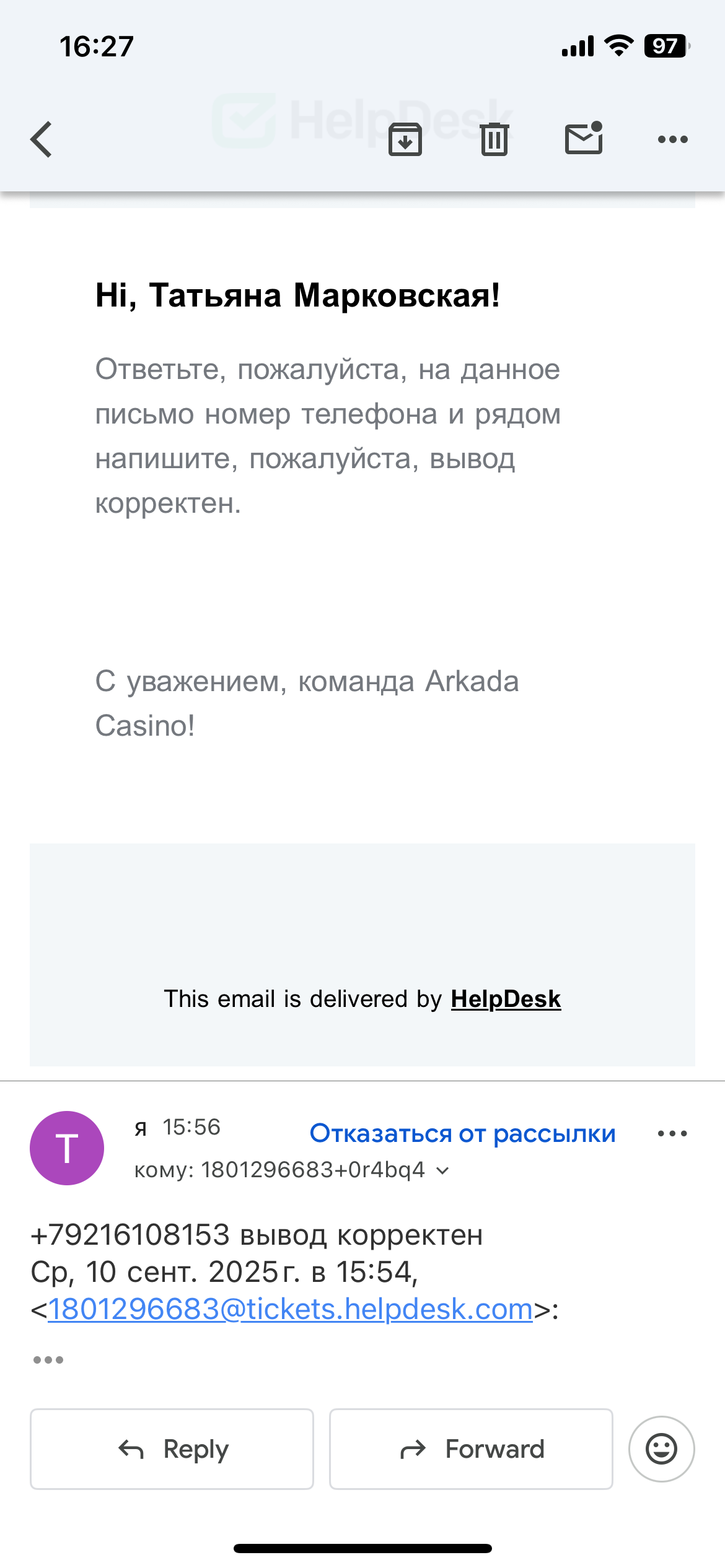 Претензия Tanya05 к Arkada Casino от 10.09.2025