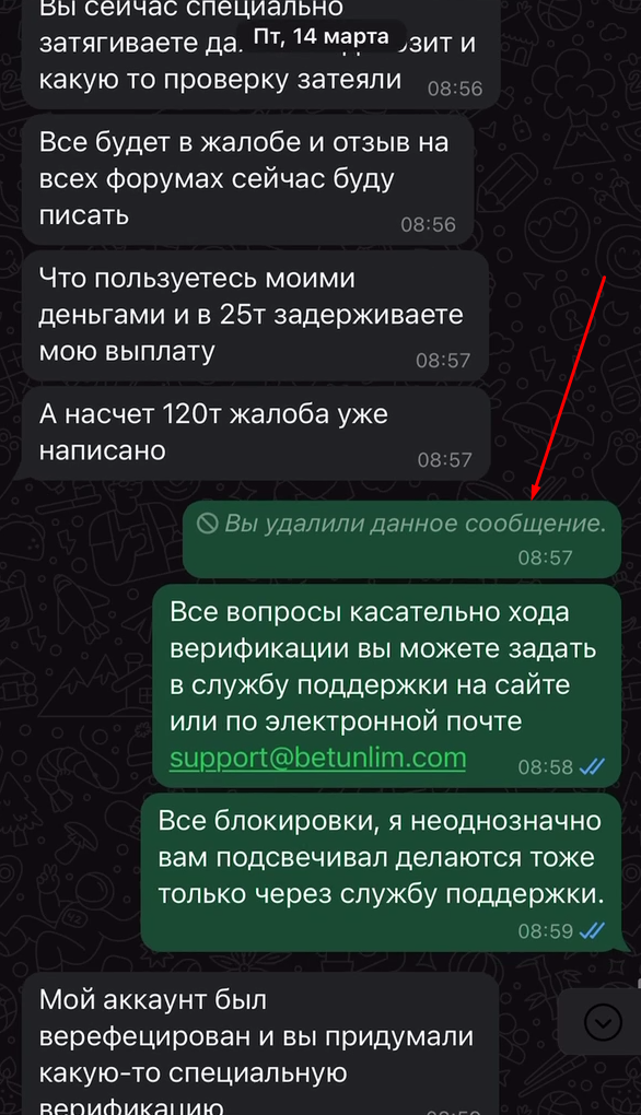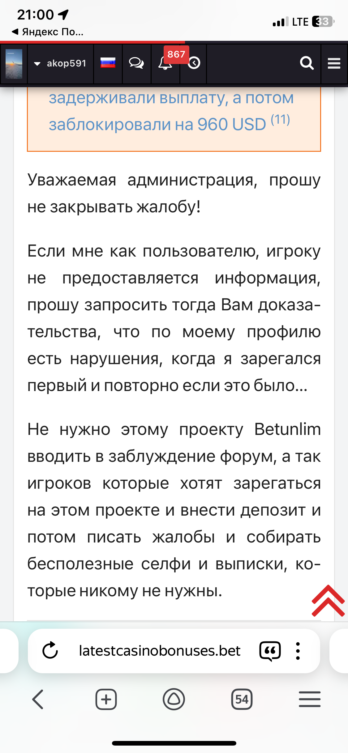 Претензия akop591 к BETUNLIM Casino от 14.03.2025