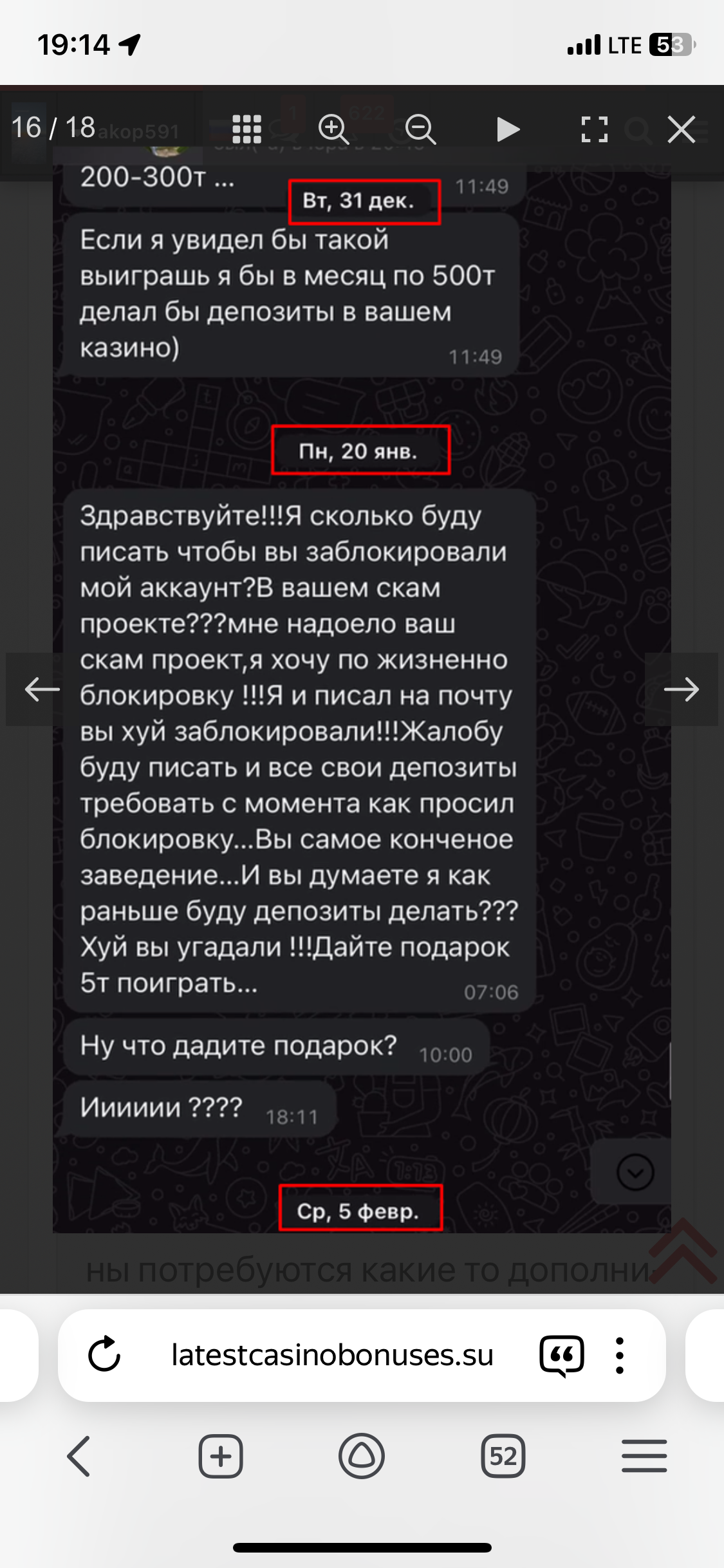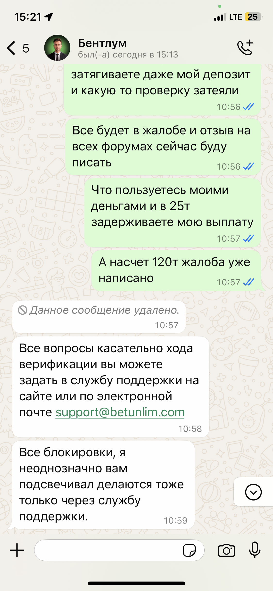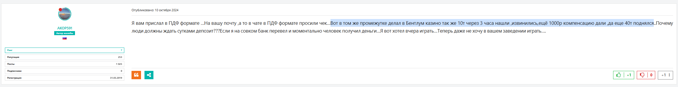 Добрый день представил казино Бентлум ,потому что я проиграл у вас до этого около 500т и никогда не видел выигрыша нормальный,и по этом матерился ,извините за мать ,ну я не однократно просил блокировать свой аккаунт,так как в надежде что-то верну рука не поднимался блокировать самому ,и писал я менеджеру ватсапе не однократно что я людоман ,почему именно в этот раз ограничили а не до этого???Я просил не слать мне рассылки,вы мало того что на почту слали ,а последнное время и в телеграмме начали слать свои рассылки…Людоману рука не поднимается самому блокировать аккаунт,а мое обращение были до этого что я зависим и вы не приняли меры…Вот только последний раз после моего проигрыша приняли меры ,почему до этого не принимали меры ???Вот Казино не очень известный Твое вчера в чате так же написал что я допустим зависим ,они моментально заблокировали мой аккаунт,а я написал допустим,и им письмо надо было написать чтобы заблокировали.А людоман в азарте делает дальше депозиты ,что хоть что-то вернет ,я же не мало оставил у вас больше 500т будте лояльный и верните мой депозиты последние..Вы в очень хорошем плюсе от меня …И я писал менеджеру в ватсапе до последнего обращение что я зависим..Вы до этого не отреагировали!!!А последный раз почему-то отреагировали …Прошу вернуть мои последние депозиты и быть лояльными к игрокам …И что за проверка? Уже не делю не даете мои 25т который не успел проиграть вывести,зачем тянете время ?Спецально обнулил мой уровень чтобы кешбек пропал и в турнире я должен был занять 2-3 место…Верните мои средства,за минусом своих расходов..