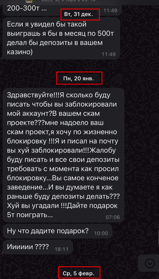 13 марта вы написали очередную угрозу, что если вы не выиграете определённую сумму, то будете писать жалобу, и написали, что вы зависимы, и неоднократно нам сообщали об этом, хотя до этого момента вы ни разу не говорили о зависимости. Цитирую: