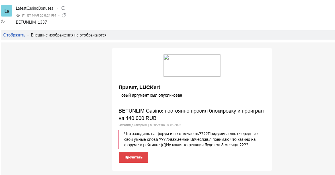 BETUNLIM Casino: постоянно просил блокировку и проиграл на 140.000 RUB