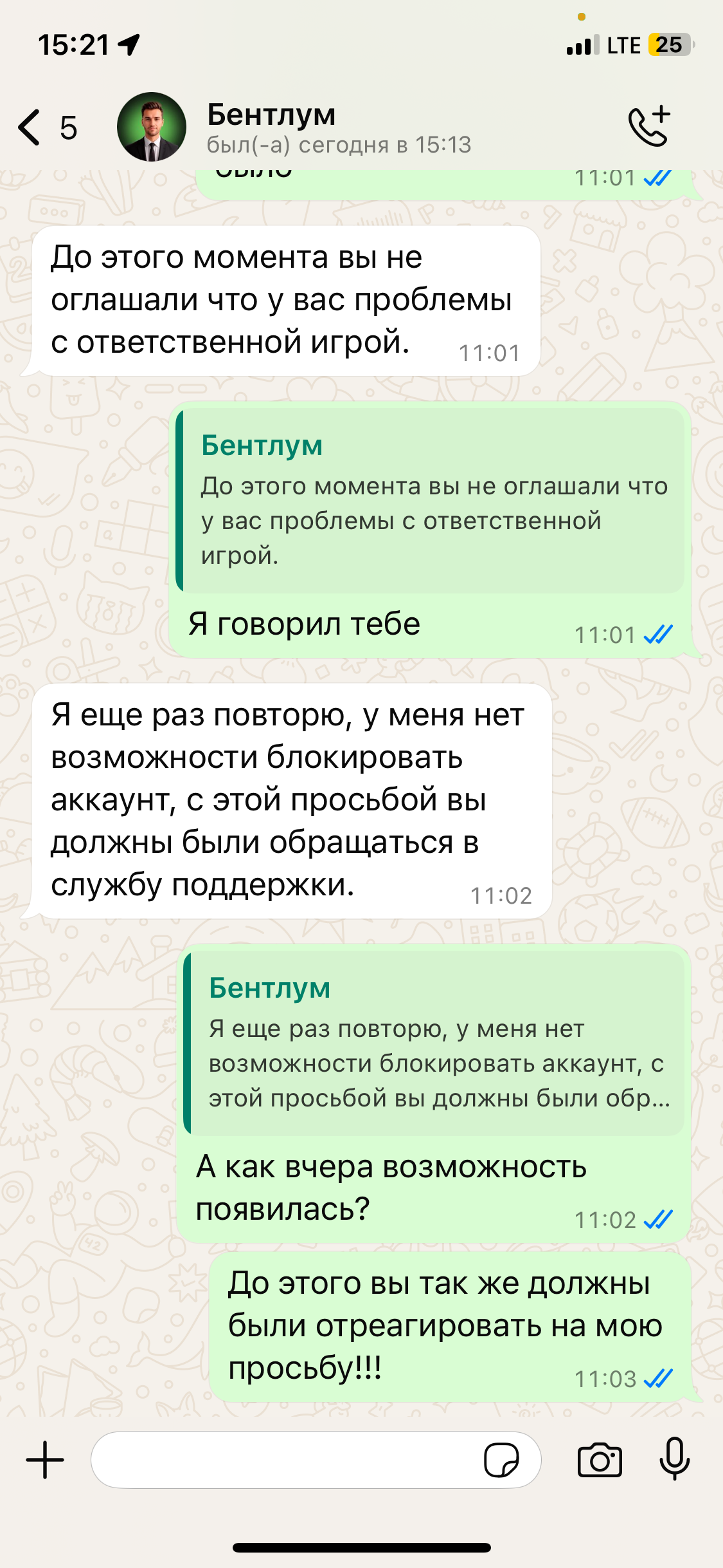 Я даже в чате оператору говорил что я писал в ватсапе что зависим и людоман , на что тоже не было отреагировал даже ваш оператор.