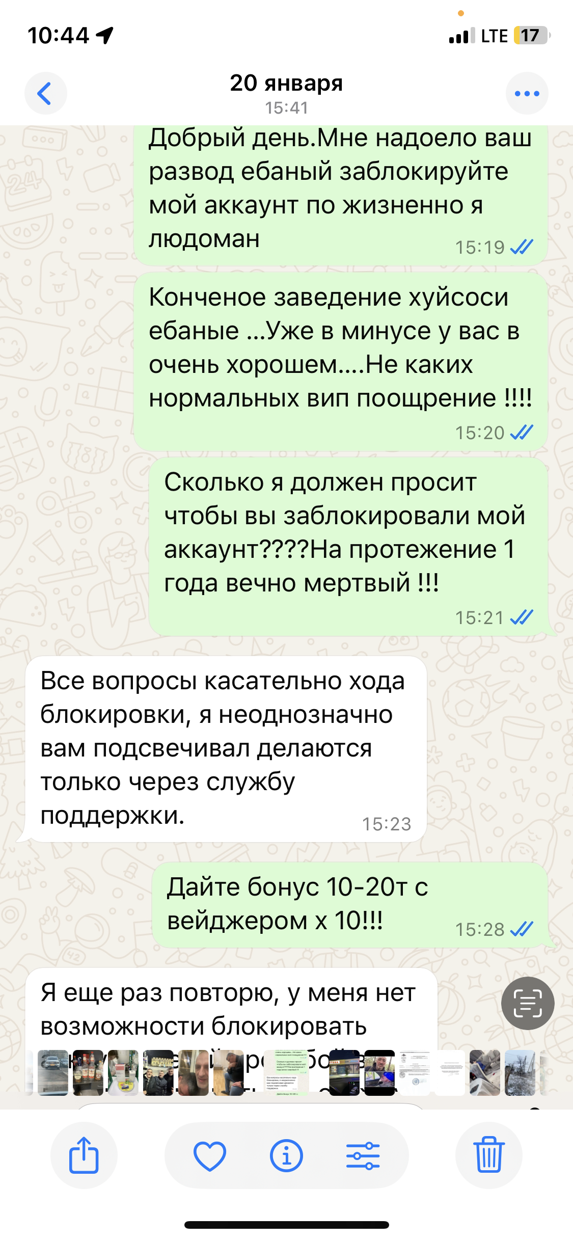 И так же 10.12 .24 года я писал и менеджеру в ватсапе ,и в чате что заблокируйте мой аккаунт я зависим.