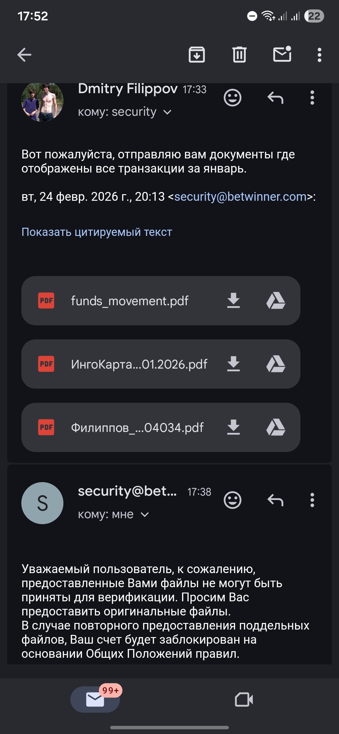 В итоге от них нет ответа, а пишет уже служба безопасности. Для начала я думал чтобы помочь мне в решении вопроса с депозитом, потому что в теме было указано не пришёл депозит.