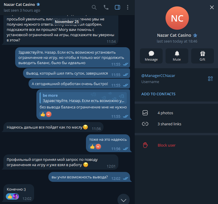 Сейчас сидел пересматривал историю с Валентиной: в ролике есть запись разговора с менеджером по телефону, где он ей предлагает подачку и ограничения на аккаунт, чтобы она могла ТОЛЬКО выводить средства. Получается, слова про техническую возможность — ложь со стороны CatCasino, после того как я сделал неоднократные запросы?