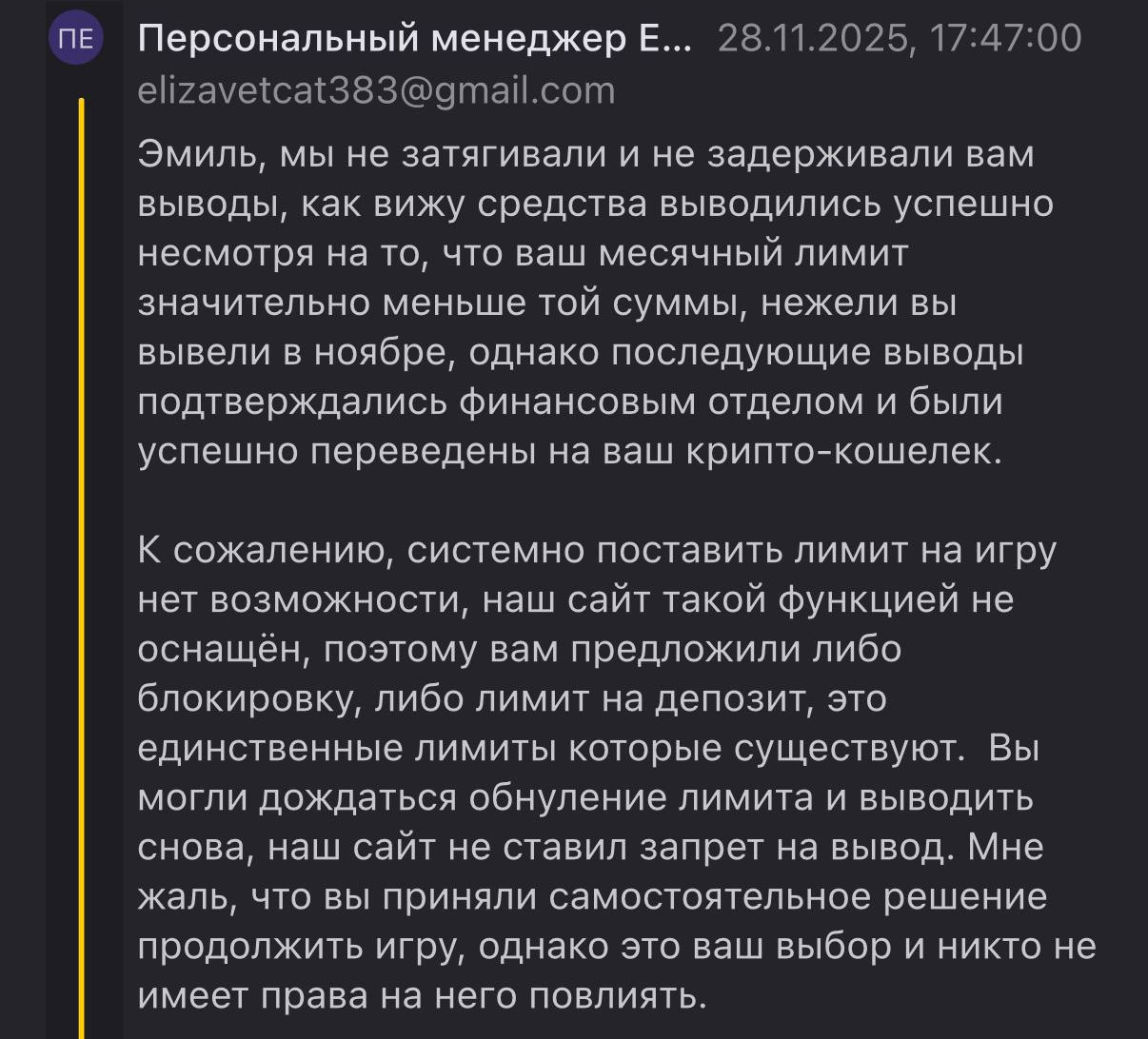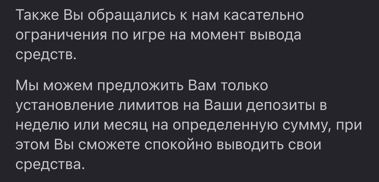 «Параллельно мы прорабатывали возможность установки отдельного ограничения на отключение игровых функций без полной блокировки. Это не является стандартной настройкой, которая применяется мгновенно, так как требует отдельного обращения в технический отдел и времени на реализацию. При этом обновление лимитов ожидалось в ближайшие дни, то есть существовала возможность дождаться сброса и продолжать выводить средства, либо воспользоваться предложенным вариантом временной блокировки.»