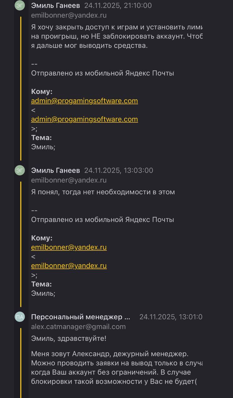 Сейчас моё общение с менеджером по почте выглядит как общение со стеной, меня не хотят понимать или старательно пытаются обходить мои тейки. По CGA Responsible Gaming Policy §9.2.3.1 (17.04.2025): при игноре Cooling-Off все ставки после первого запроса (24.11) — voided, и казино обязано вернуть полный баланс на момент запроса (14 400 000 RUB).