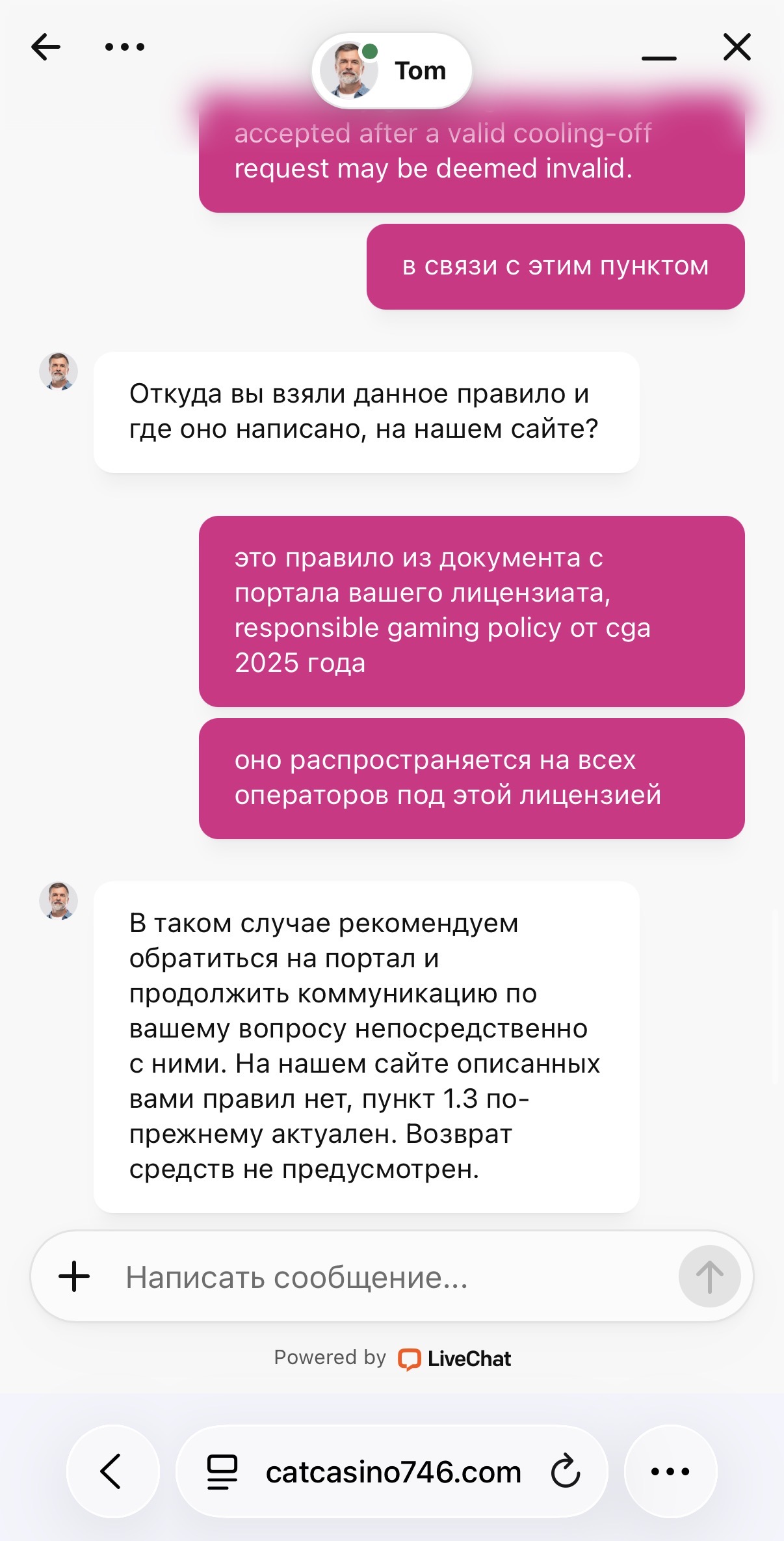 Я прошу полный возврат 14.400.000 рублей (проигрыш после 24.11 как недействительные ставки по CGA 9.2.3.1), после выплаты этих средств на мой кошелек с баланса — полная блокировка от игр (Self-Exclusion). Я считаю, что это будет вполне справедливо. Надеюсь, что @admincatcasino ознакомится с этой ситуацией и сможет дать ответ хотя бы по этому сообщению, потому что менеджеры отправили меня в полное игнорирование, после сообщений с прикрепленными правилами ответственной игры.