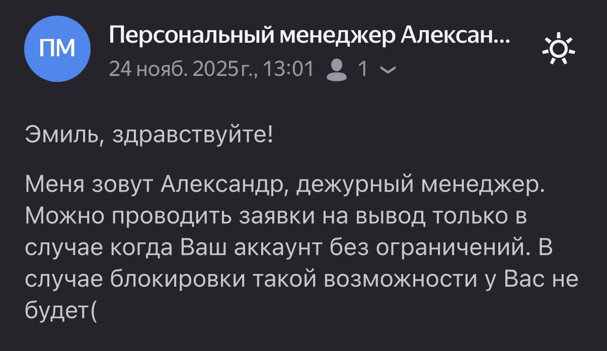 11:57 От дежурного менеджера Елизаветы приходит письмо на почту, что с моими вывода всё в порядке и они находятся на дополнительной проверке платежного провайдера, что нужно ожидать.