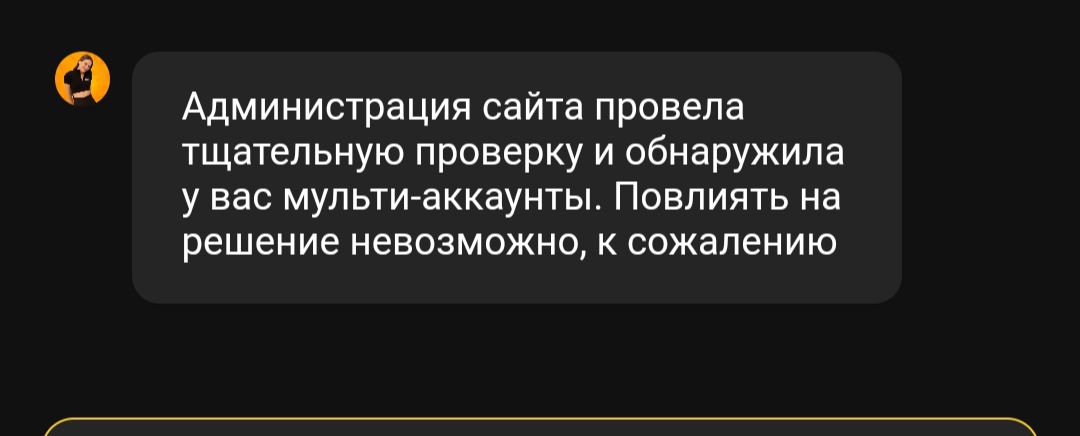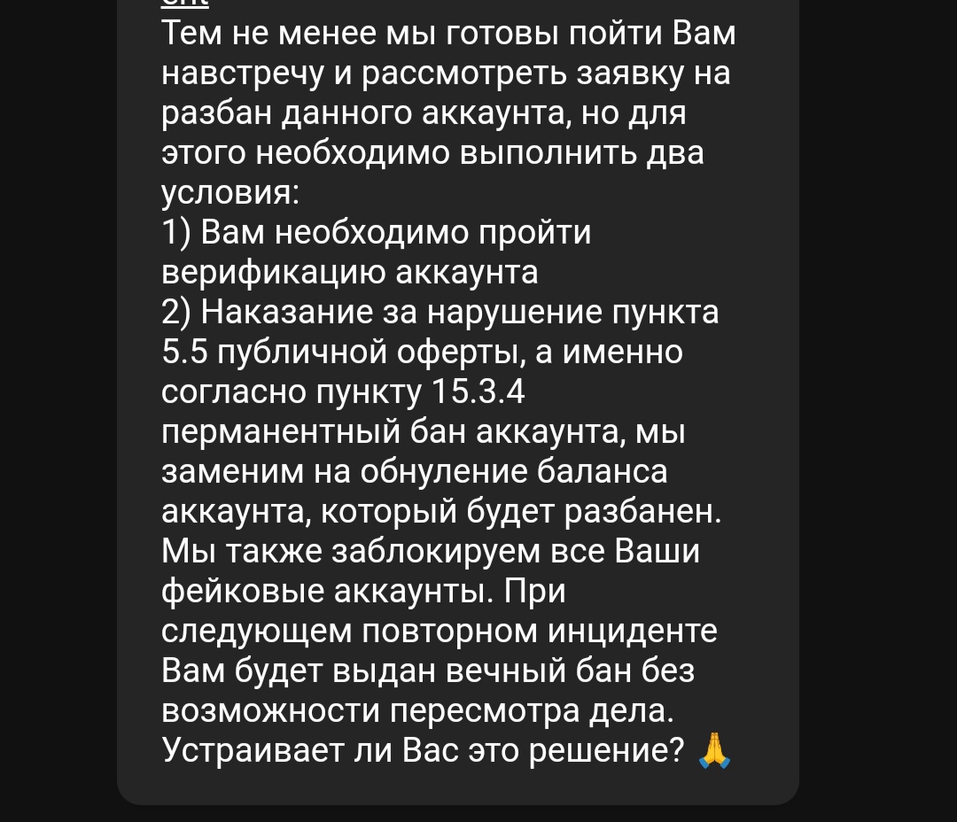 Здравствуйте. Выйграл у стримера на стриме денег на драгон 10тыс рублей.Пошел играть и часть поставил на вывод на спб. Через несколько часов отменили вывод с причиной- попробуйте другой способ. Далее поставил 10к на вывод ещё раз, через минут 10 с причиной- отыграть х3. Ок, пошел отыграл. На балансе было 15 тысяч рублей, поставил две заявки на спб. Через несколько часов заходил на акк и заявки висели в ожидании, ещё через пару часов захожу и вижу надпись -аккаунт заблокирован причина мульти аккаунт. Аккаунт единственный личный, авторизация через ВК подтвержденную страницу, Зареган лет 5 назад.Выводы до этого были. Видимо слишком большая сумма для них и решили придумать причину что бы не платить. Прошу разобраться в данном вопросе и разблокировать аккаунт и вернуть деньги.