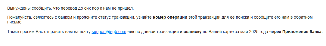 Также просим Вас отправить нам на почту [email protected] чек по данной транзакции и выписку по Вашей карте за май 2025 года напрямую из Приложения банка, а не с вашей почты в виде pdf файла.