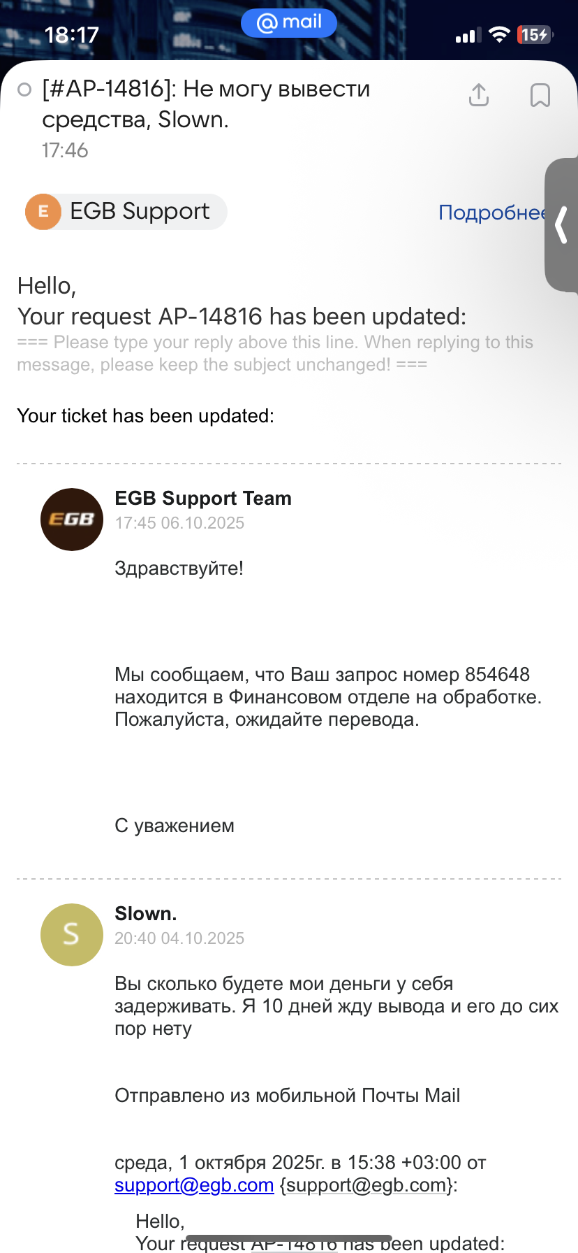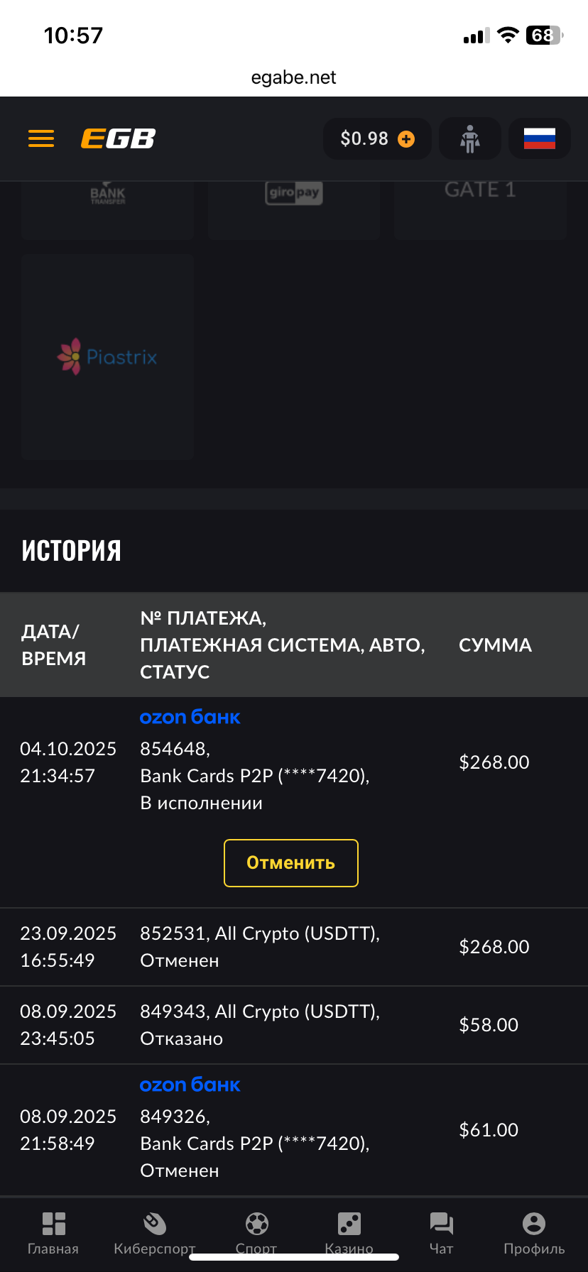 EGB Casino: с 23.09.2025 не выводят деньги на 268 USD