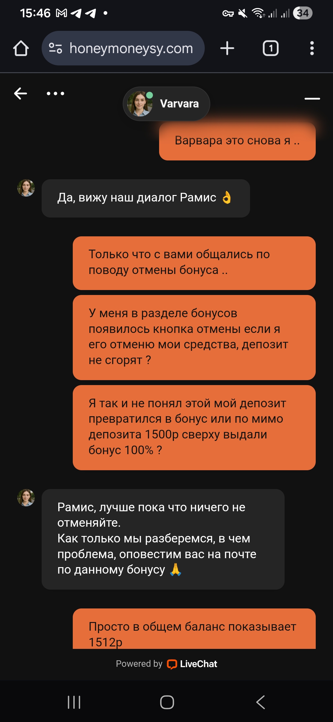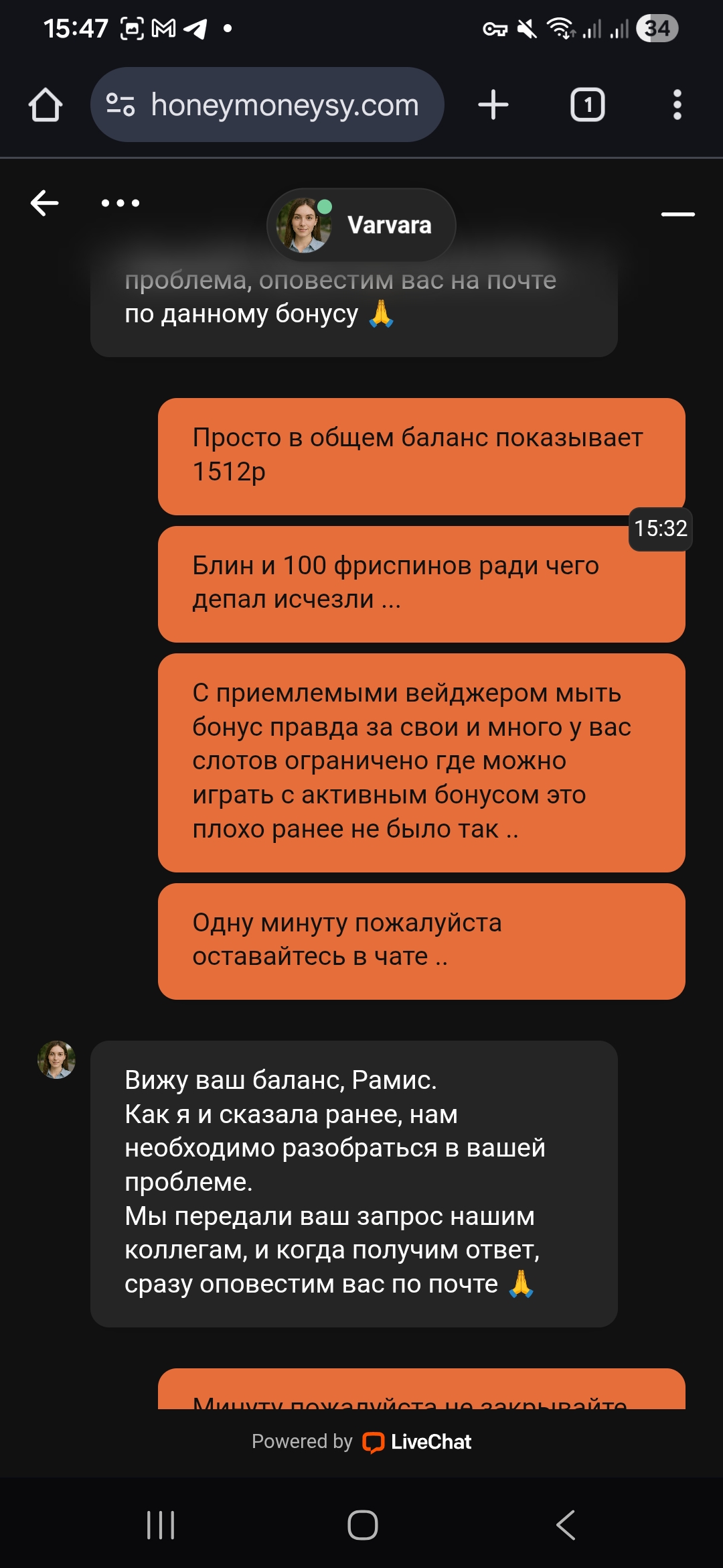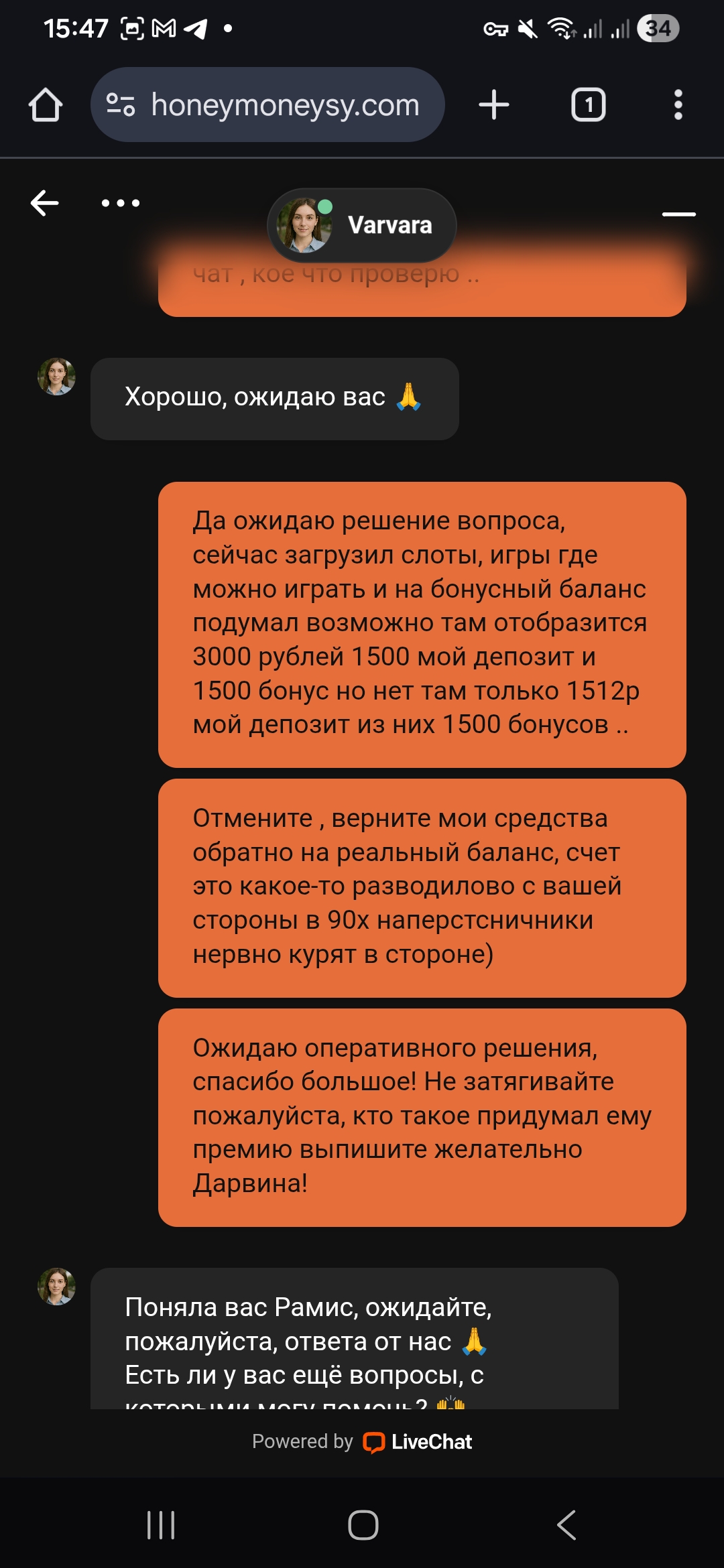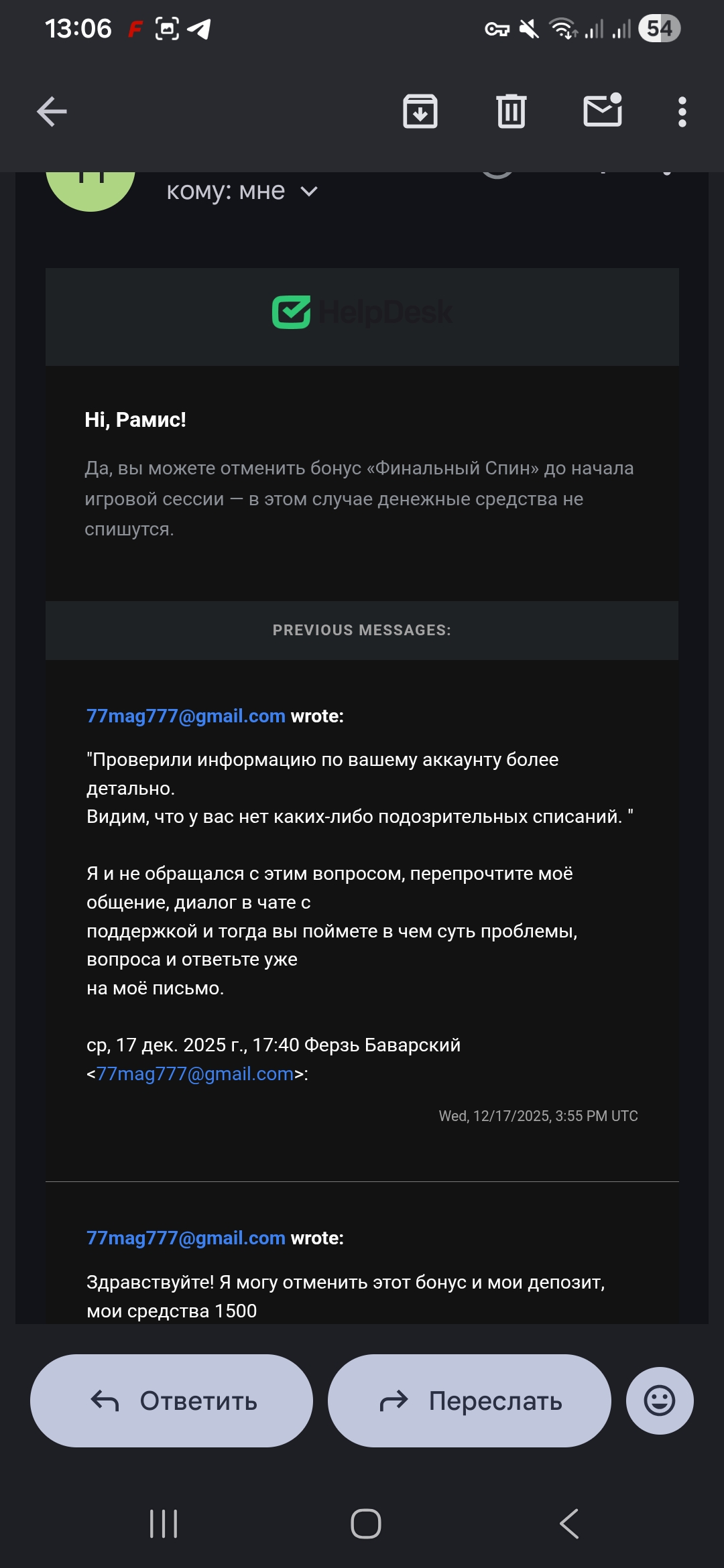 Ни делая ни одного спина обратился в чат поддержки объяснил всю ситуацию, сказал, попросил чтобы мне отменили этот бонус и вернули мой депозит, на реальный баланс, счёт, Варвара сотрудница после общения передала вопрос в тех отдел и попросила подождать ответа на почту, на что закрыл диалог, после я решил снова обратиться и снова была Варвара решил проверить возможно в играх в слотах в разрешенных играть на бонусные средства появится, отобразится вся сумма депозита и бонуса 3012р, но нет не появилось в итоге запрос в тех отдел остался актуально.