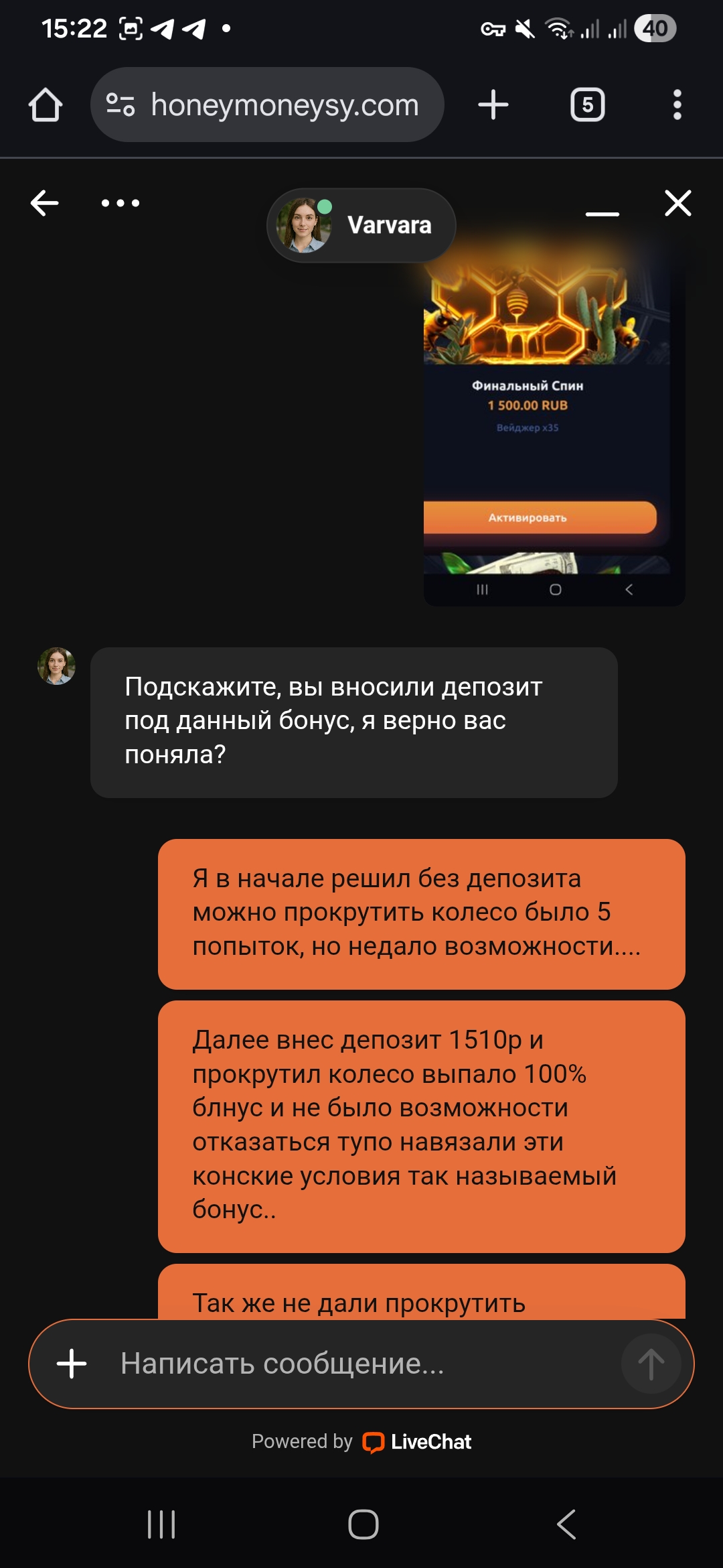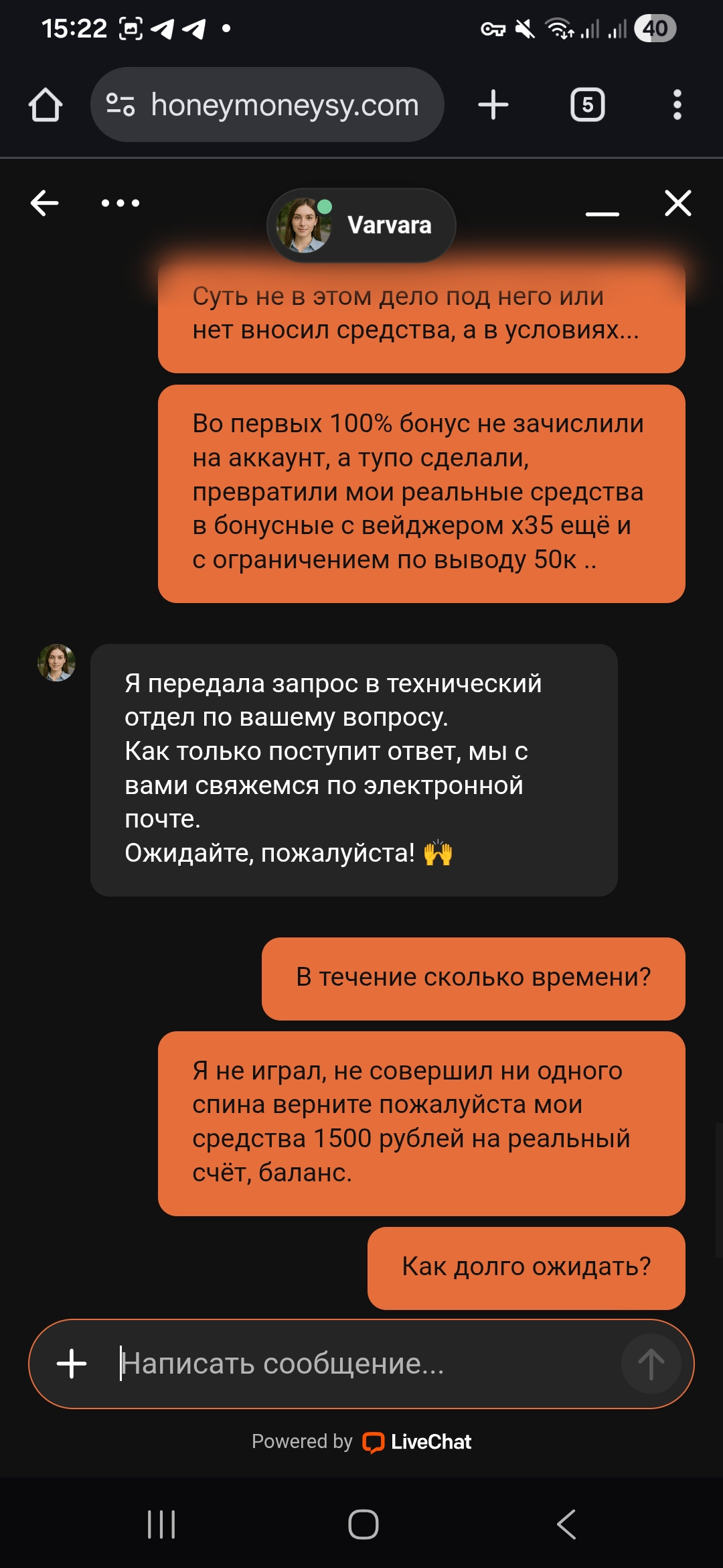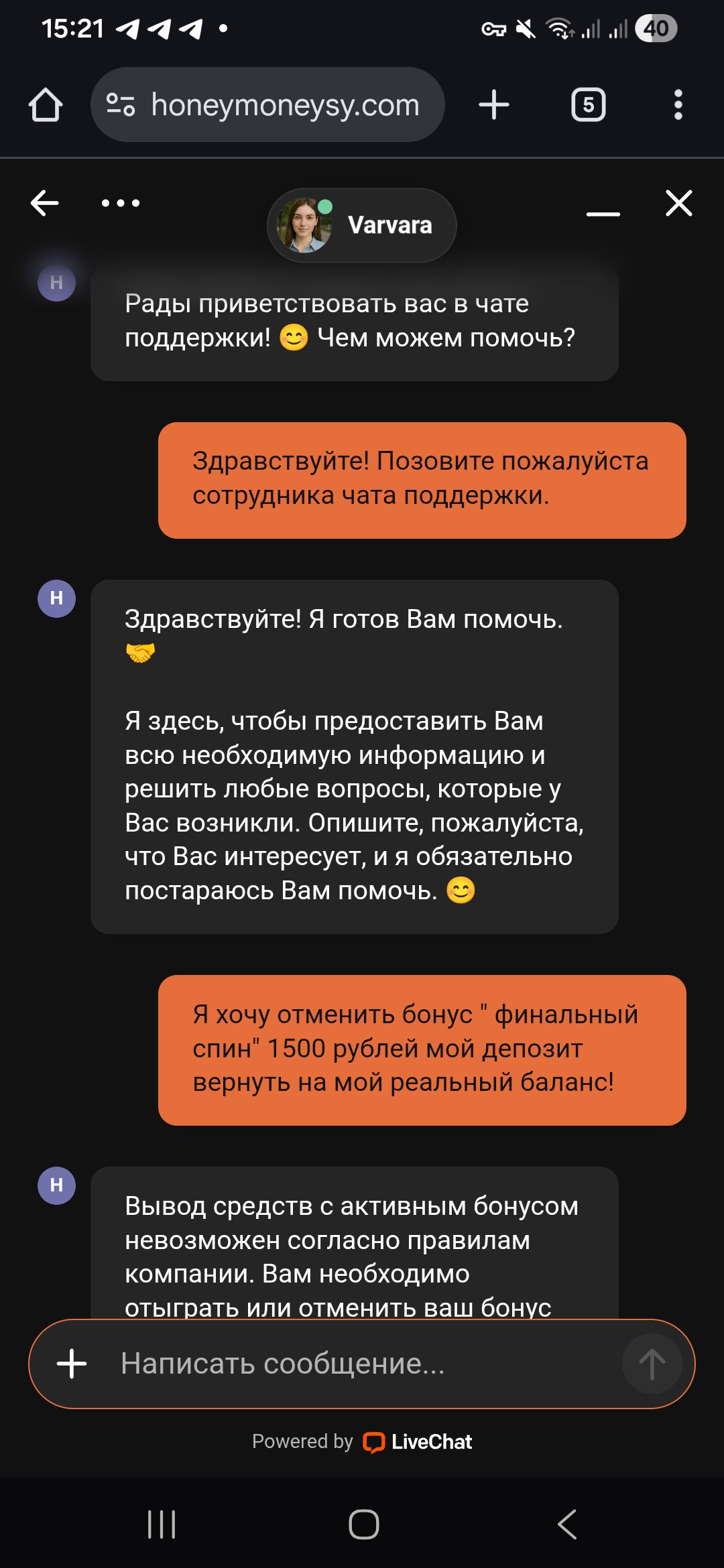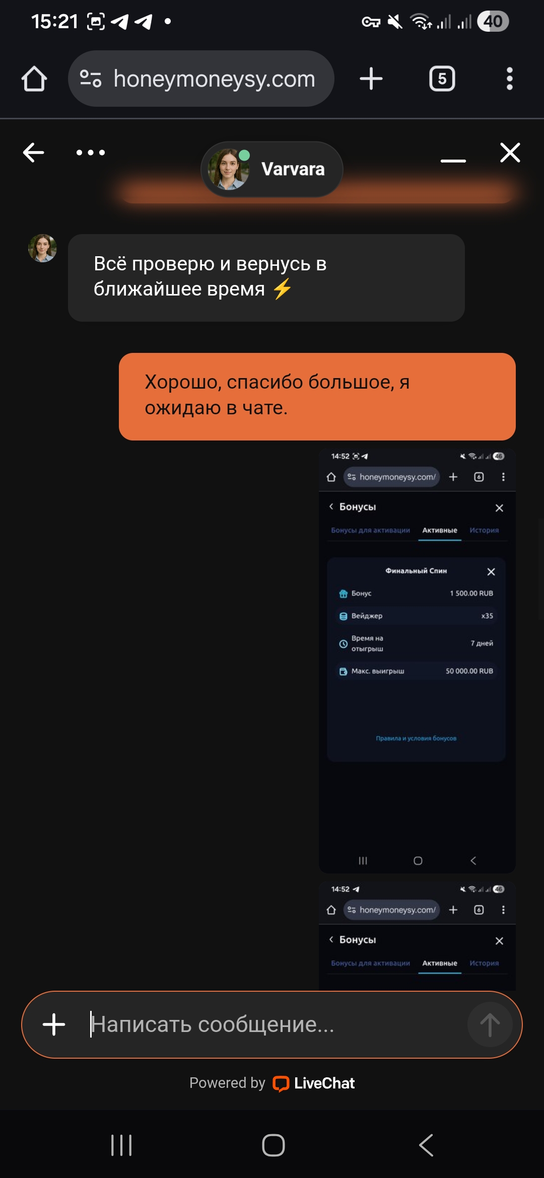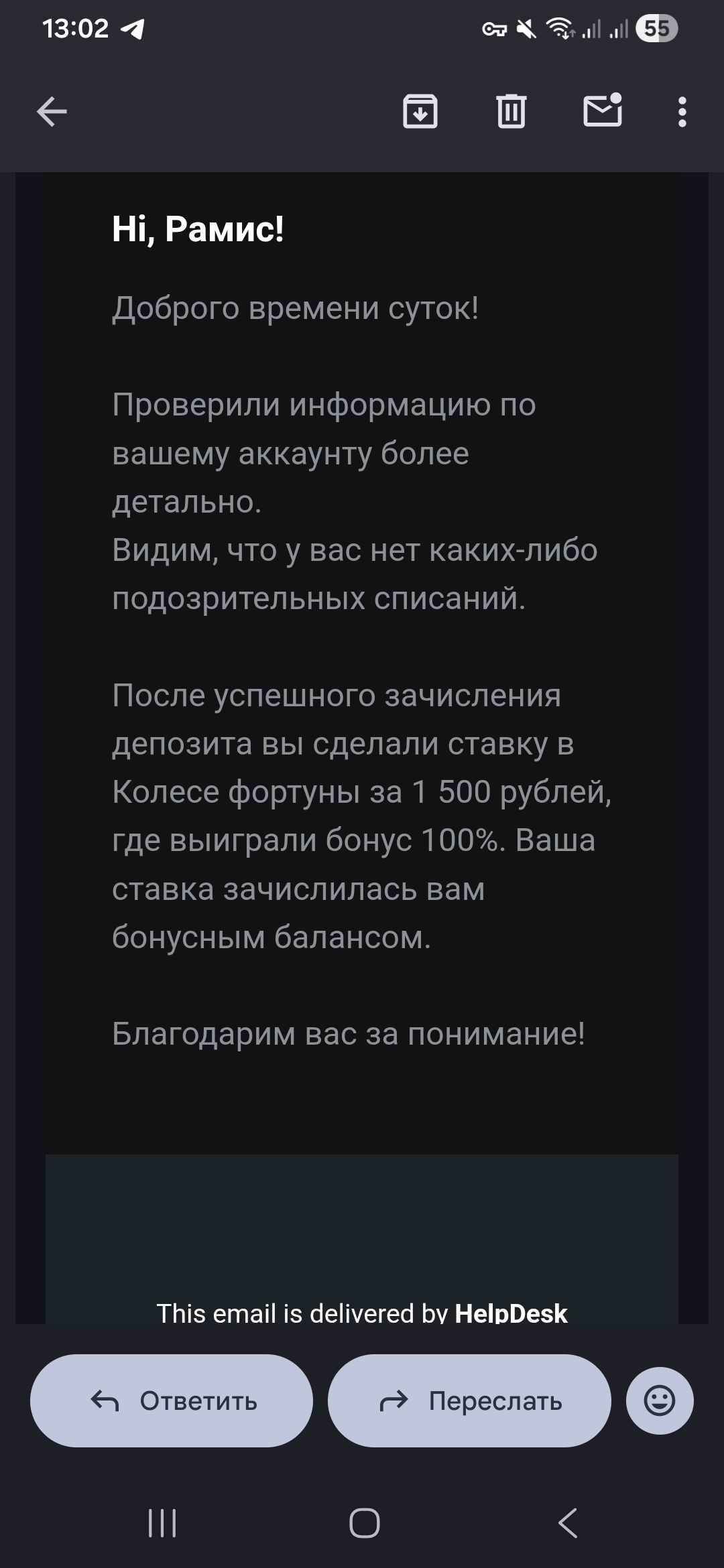 Ни делая ни одного спина обратился в чат поддержки объяснил всю ситуацию, сказал, попросил чтобы мне отменили этот бонус и вернули мой депозит, на реальный баланс, счёт, Варвара сотрудница после общения передала вопрос в тех отдел и попросила подождать ответа на почту, на что закрыл диалог, после я решил снова обратиться и снова была Варвара решил проверить возможно в играх в слотах в разрешенных играть на бонусные средства появится, отобразится вся сумма депозита и бонуса 3012р, но нет не появилось в итоге запрос в тех отдел остался актуально.