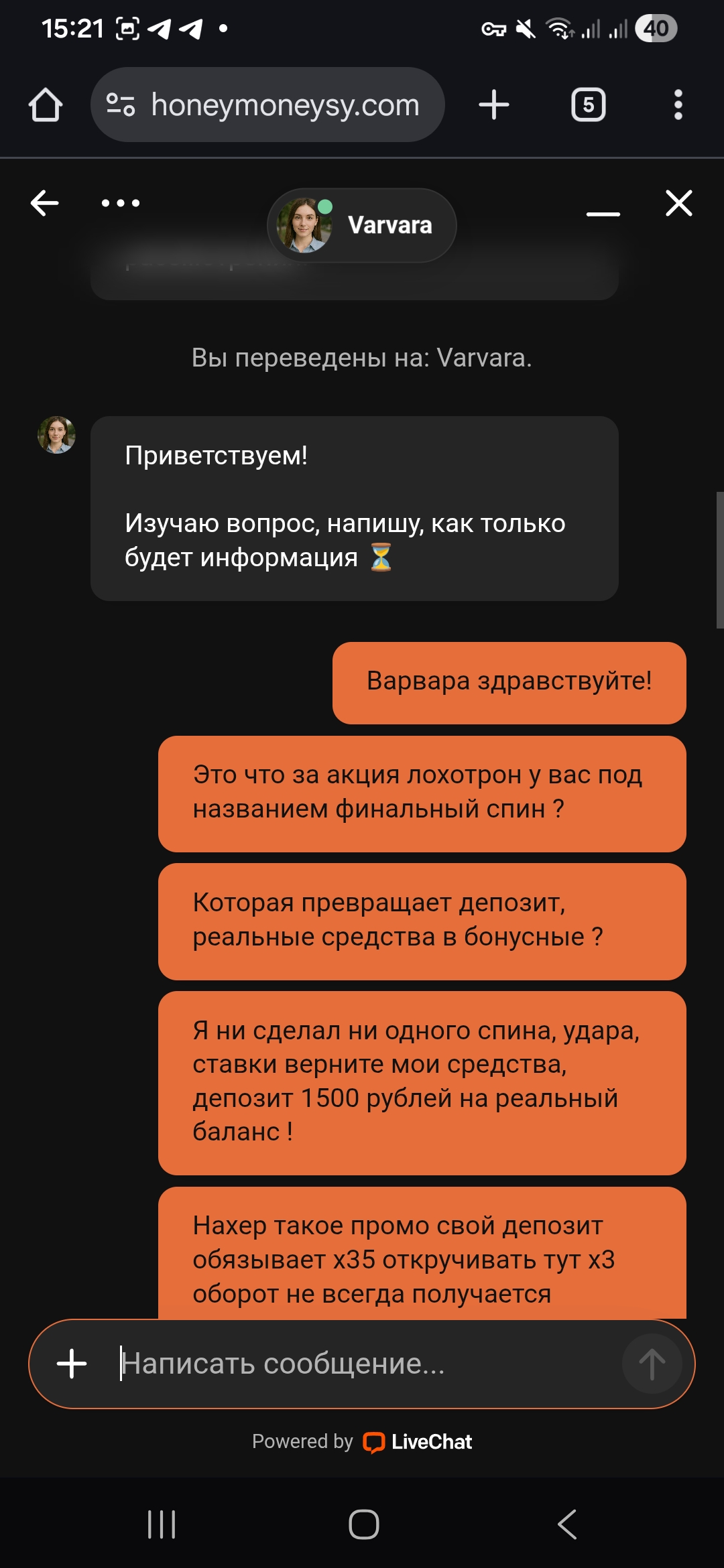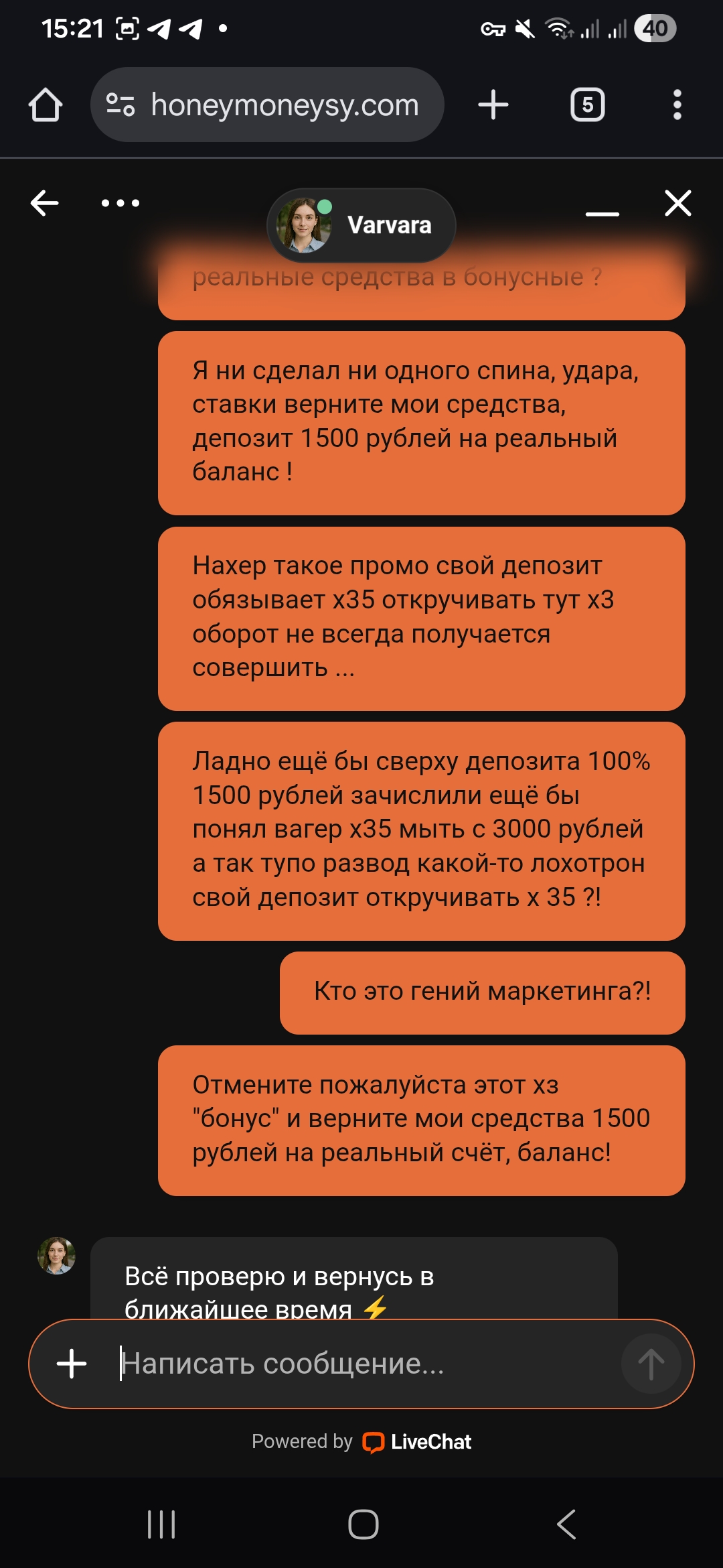 Далее не знаю почему она Варвара мне ответила, что переначислить бонус они не могут, хотя у меня не было и нет данной цели и я к ним обратился совершенно по другому вопросу, но и тут как оказалось всё они могут, скинув очередной раз ссылку на жалобу попрощался и закрыл чат, так же решил отправить ссылку переписки письмом с тех. отделом тем которые мне и ответили ничего не спишится из-за которых всё это и началось и Аллилуйя ответили максимально оперативно и что вы думаете они мне перезачислили 1.5к бонусом с теме же условиями .. хотя там же Варвара так же убедительно говорила об невозможности этого )) вы там связь держите между собой и придерживайтесь что ли к одной линии… а первоначальный депозит они вернуть не могут )) и не стыдно им за 1.5к вести себя » как уж на сковороде » .. да уж ханимани не ожидал от вас такого, одно разочарование…