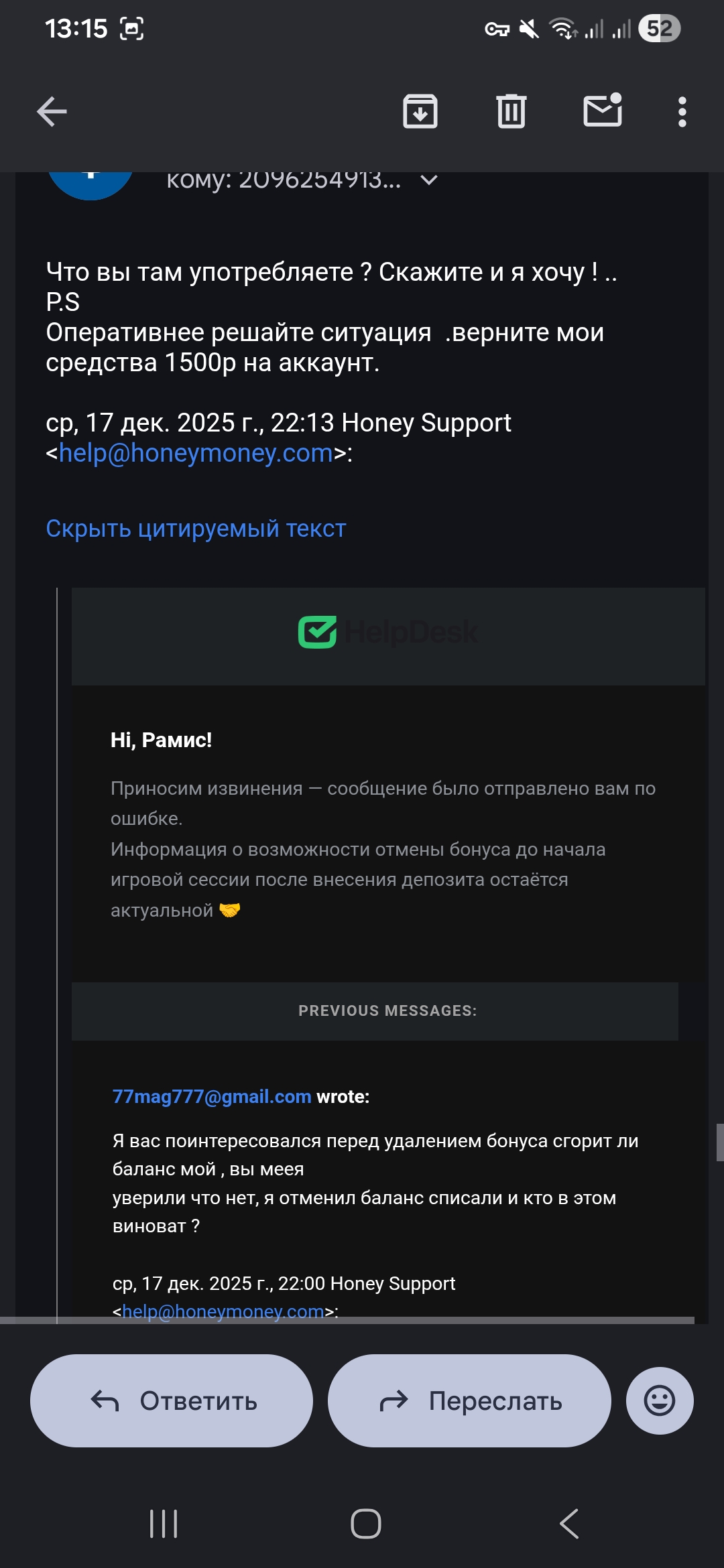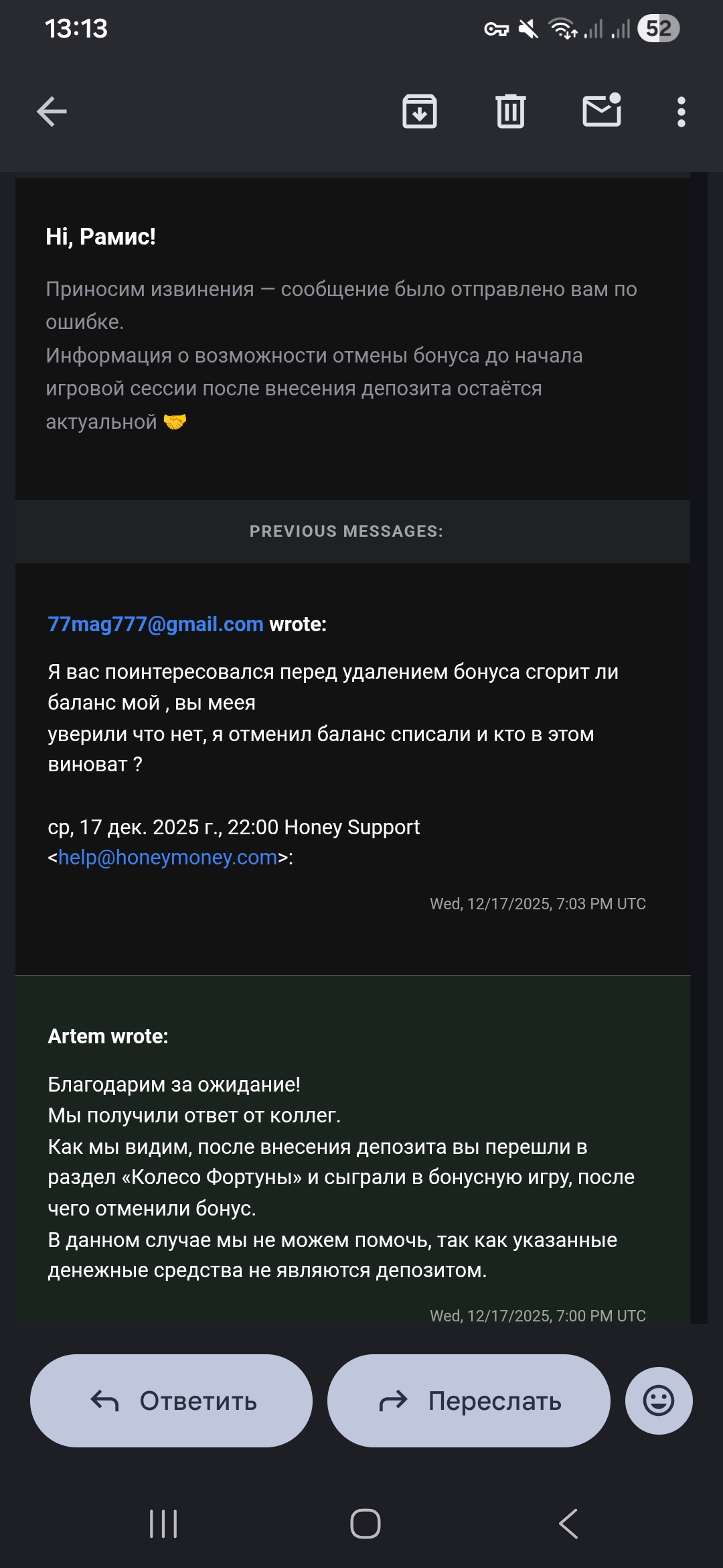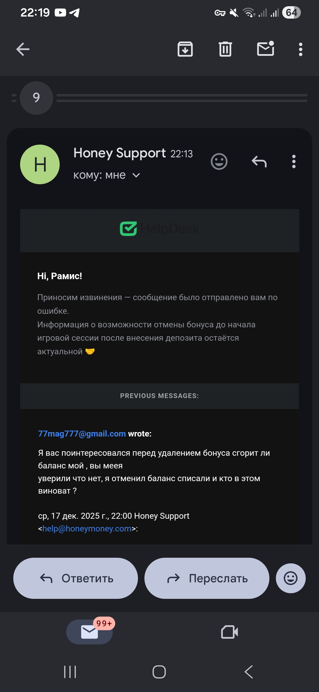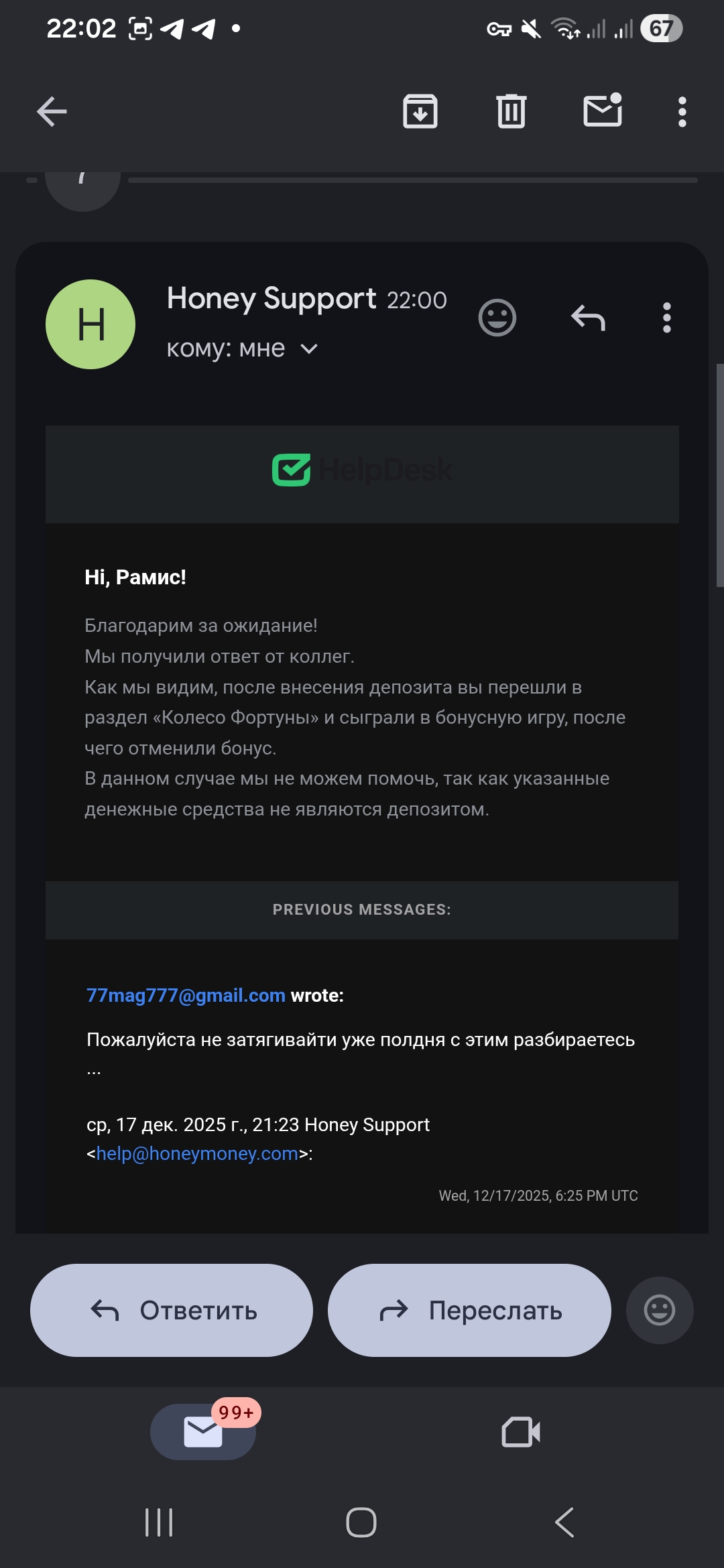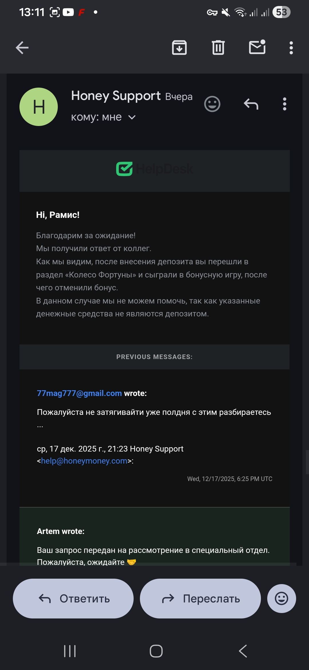 Претензия pokerface к Honey Money Casino от 18.12.2025
