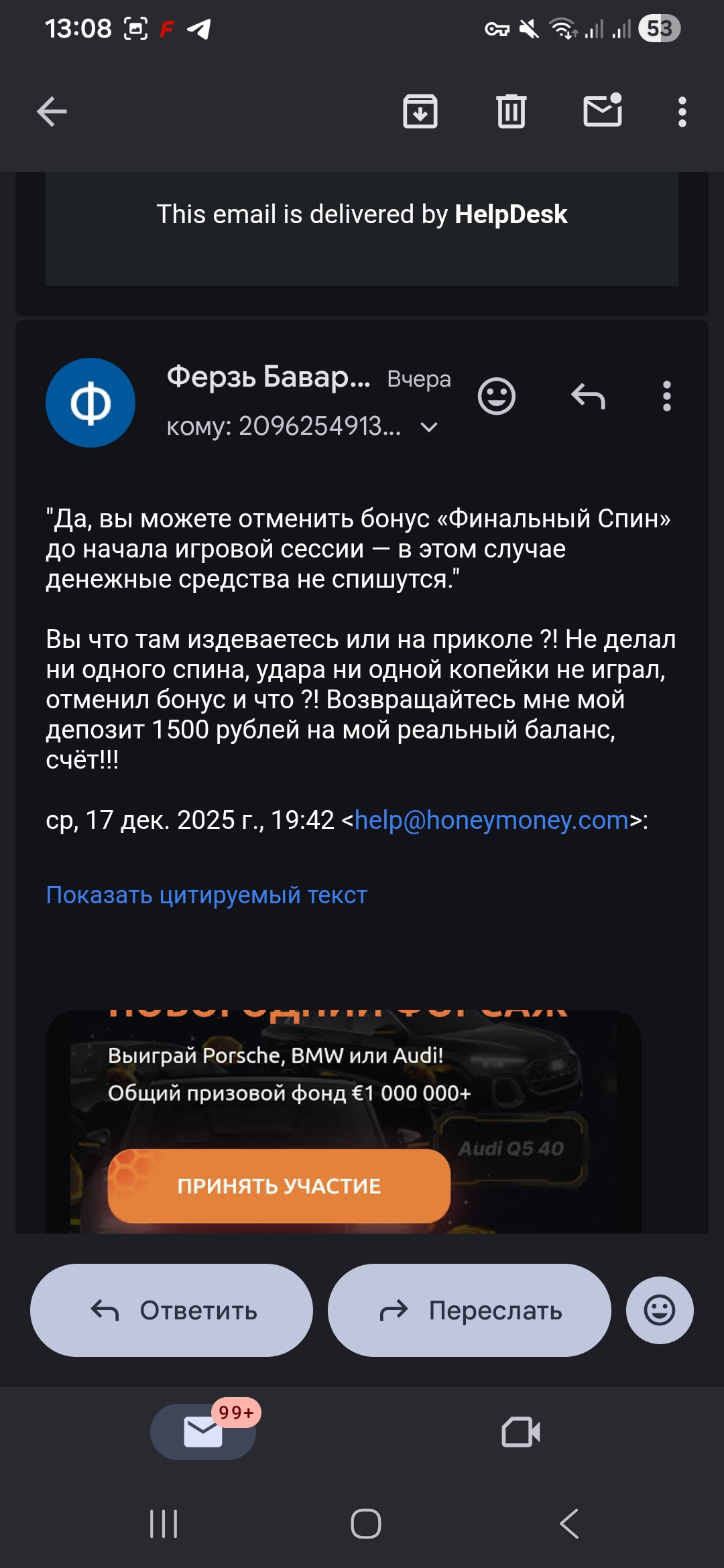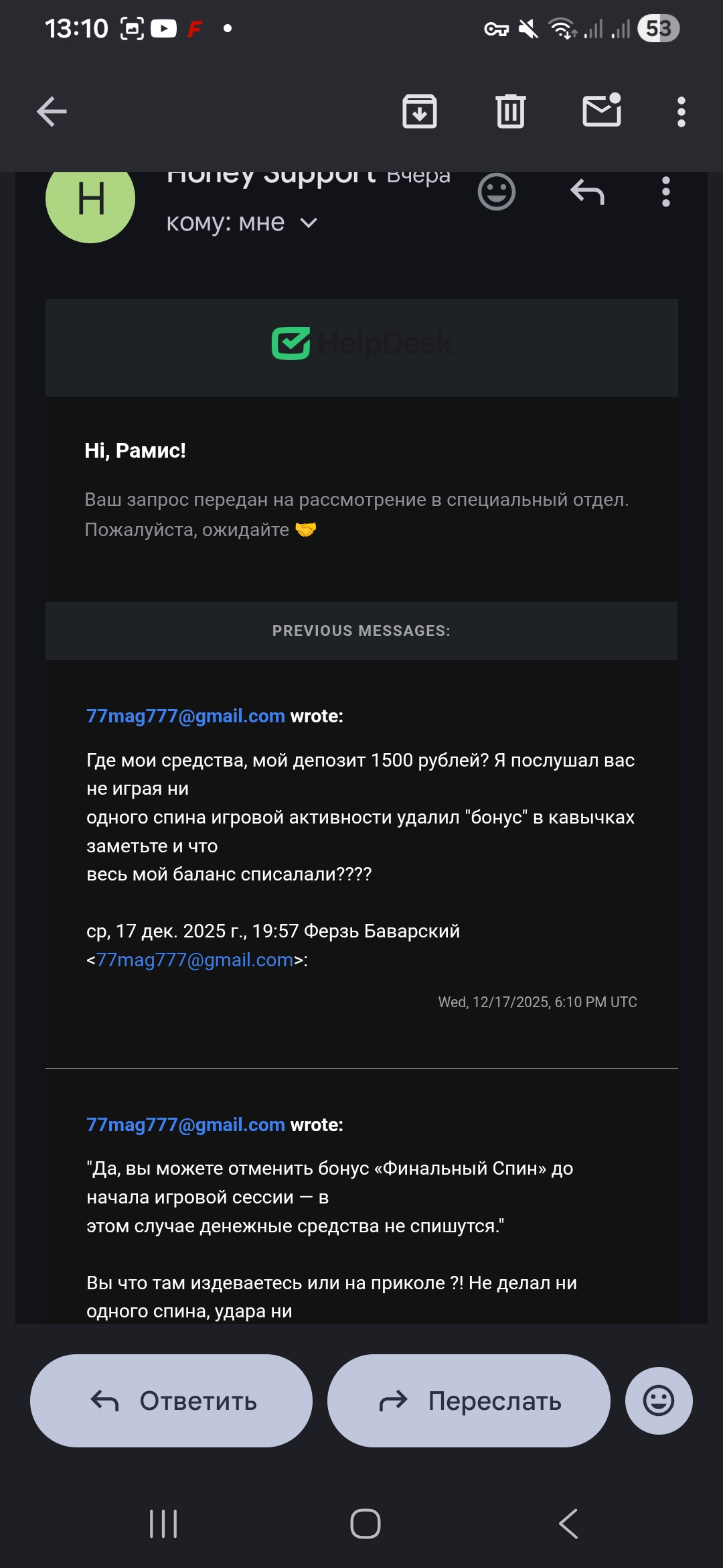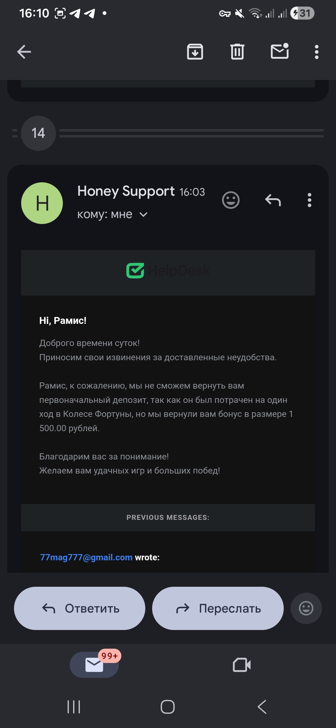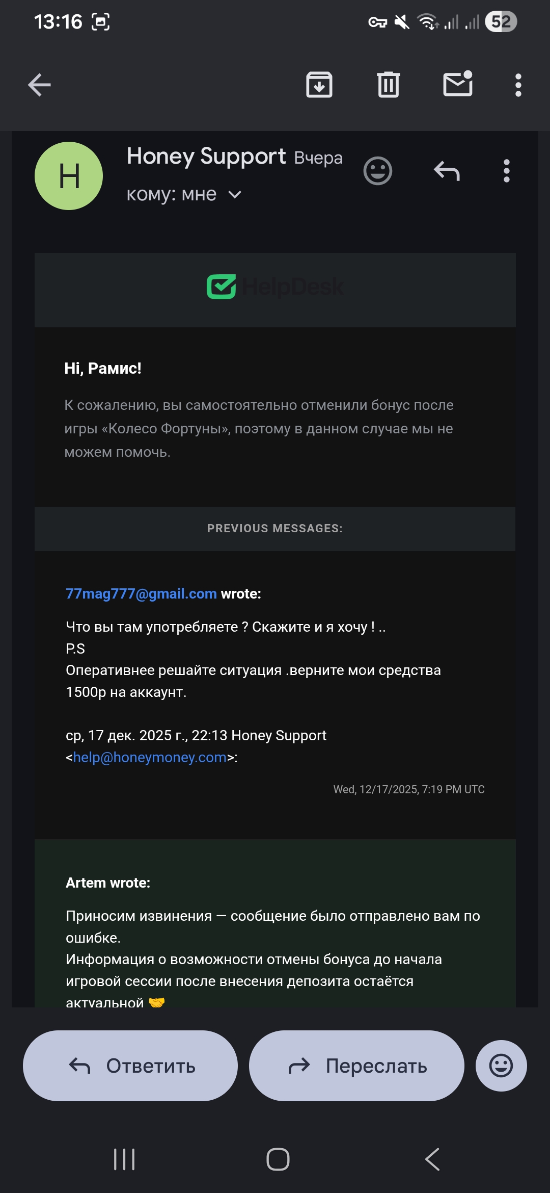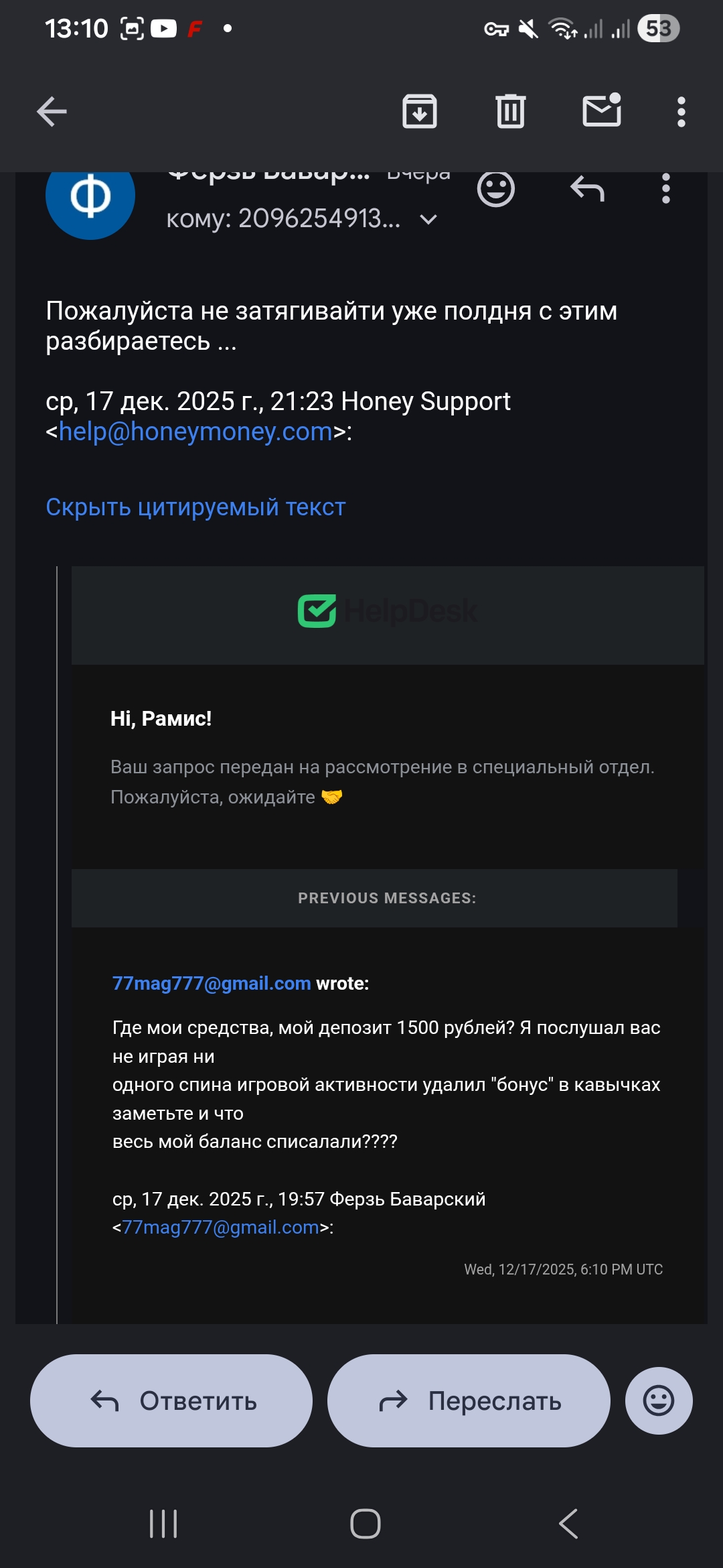 Претензия pokerface к Honey Money Casino от 18.12.2025