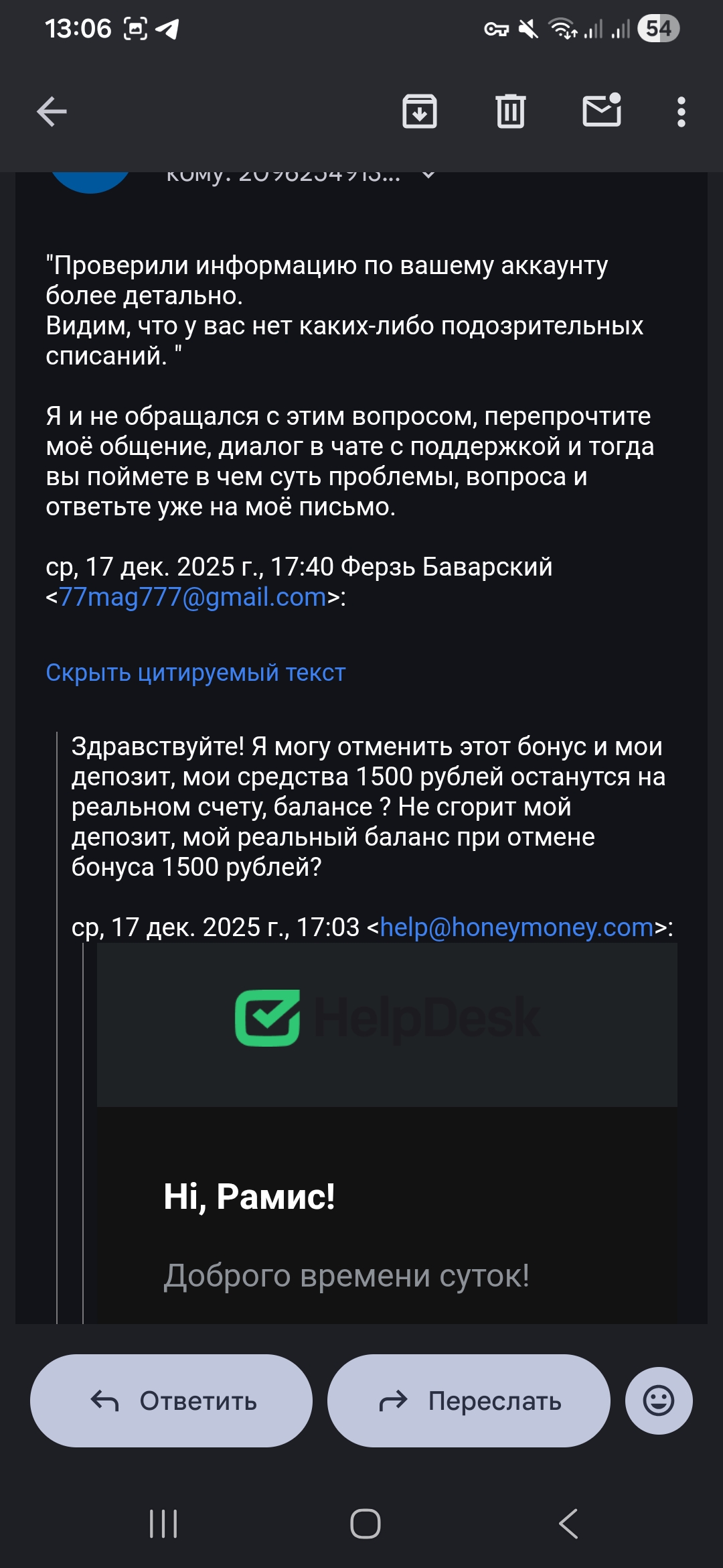 Далее я написал в ответном письме суть обращения и поинтересовался могу я отказаться от бонуса 1.5к и при этом не спишут ли они мне мои реальные средства, мой депозит на что получил утвердительный ответ, что да: