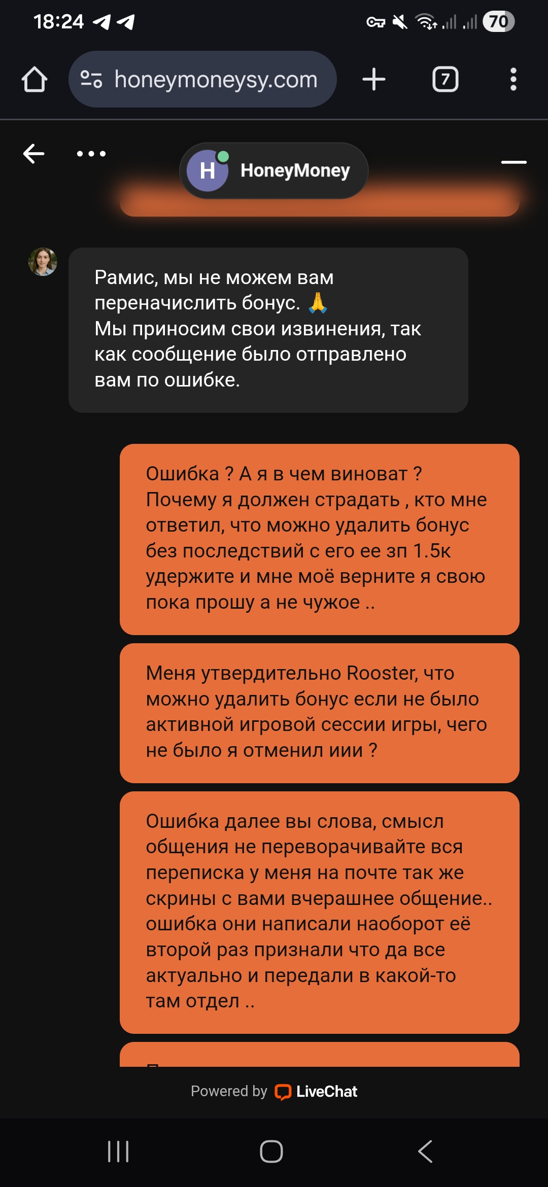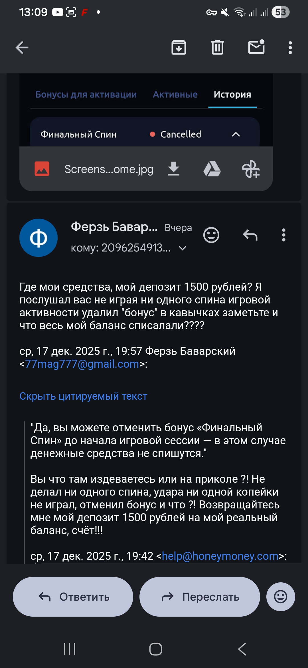 После написали мол я использовал бонус акцию » финальный спин » и сам его отменил тут они помочь ни чем не могут, далее на мой ответ вы же меня в этом убедили, утвердительно ответили могу отменить и средства не спишутся, снова ответили простите это вам было отправлено сообщение по ошибке вы можете отменить бонус всё актуально врпрос передали в отдел работают над ним… после моей просьбы ускорить сея процесс 3-и или 4-и раз я уже сам запутался сколько раз они «переобулись» )) ответили сам виноват , отменил бонус эти средства были бонусными и возврату не подлежат, ни чем помочь не могут …