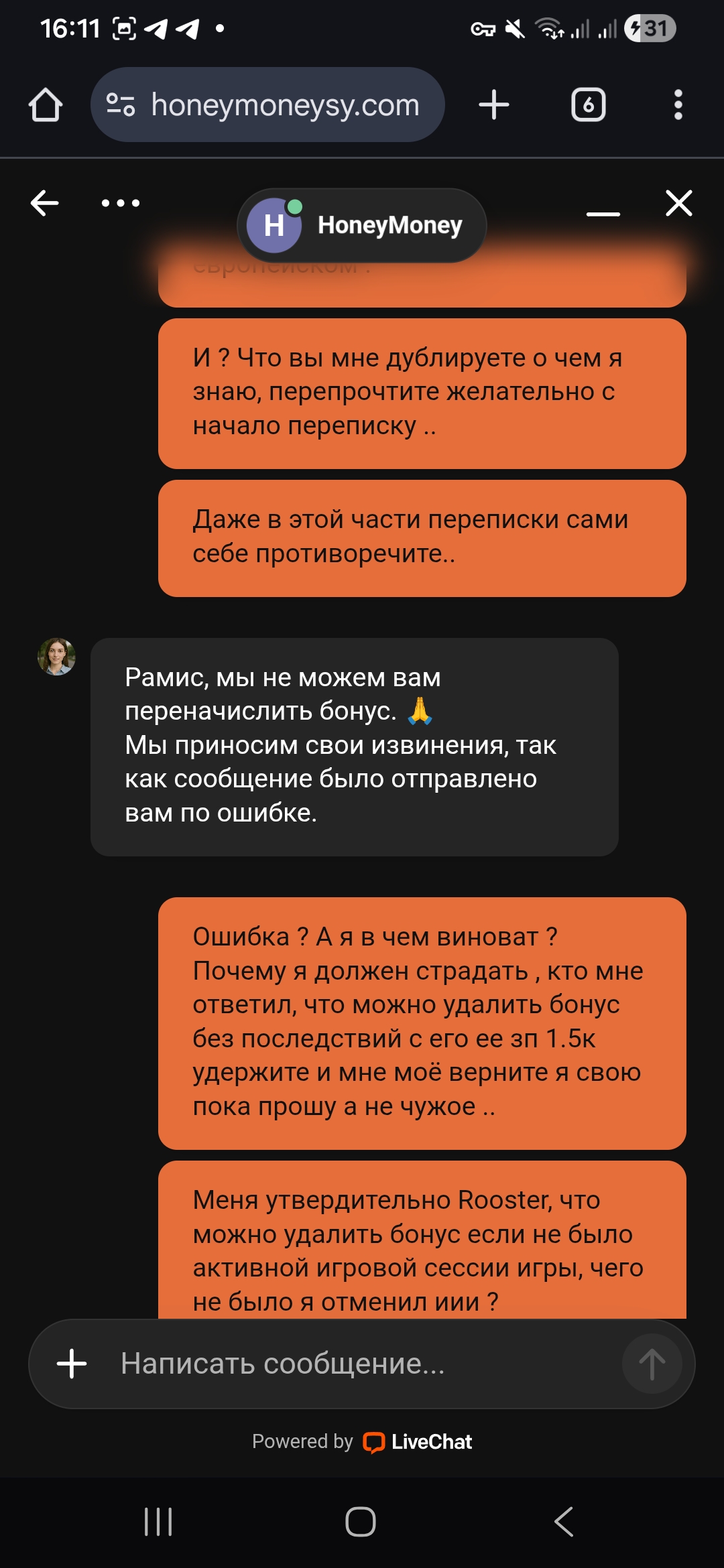 Верните мне мои средства, депозит 1.5к на реальный баланс у вас и так х3 вагер на деп не факт, что я откручу, выиграю что-то и дело дойдёт до вывода.. мне такой аналогичный бонус не нужен понимаете ?