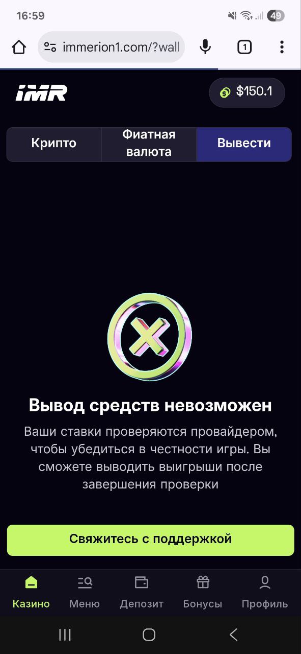 В декабре 2024 года выиграл у Immerion примерно $505, пару заявок вывели на $280, оставшиеся 225 не вывели и начали проверку ставок (отправили на проверку провайдеру), срок обозначили до 14 дней, но проверка длилась примерно пол года, каждое обращение на счёт затягивания сроков проверки писали только отписками, мол мы отправили на проверку провайдеру, ждём от них ответ, от нас ничего не зависит. За это время я деньги слил, после разблокировали проиграл пару депозитов, сейчас закинул $30 выиграл $150, поставил на вывод, выплату отменили и опять отправили на проверку провайдеру. После обращения, почему опять отправили на проверку, получил стандартную отписку, мол срок 14 дней или больше. Считаю это крайне недобросовестно. И прошу содействия, чтобы не допустить ещё одной проверки на пол года