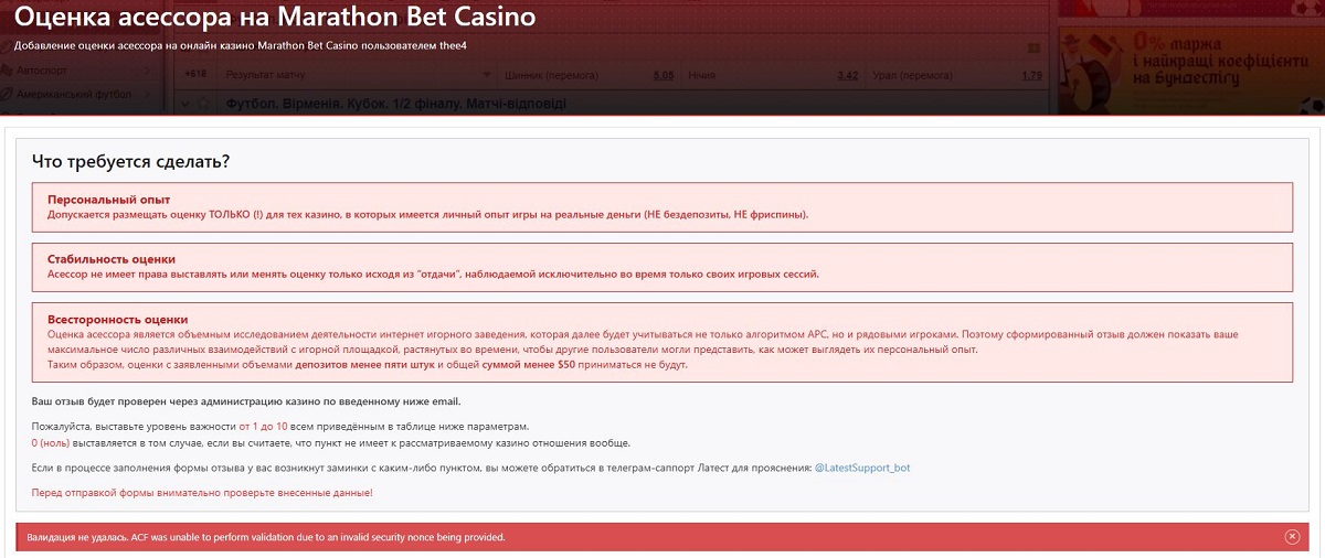 Дико извиняюсь попытался выставить оценку ассессора по БК МарафонБет, но в окне текст :