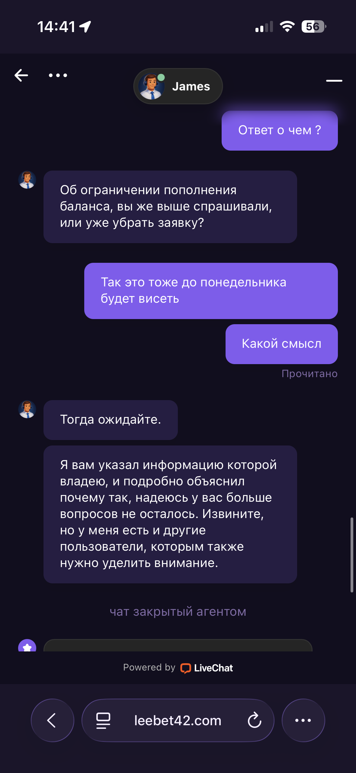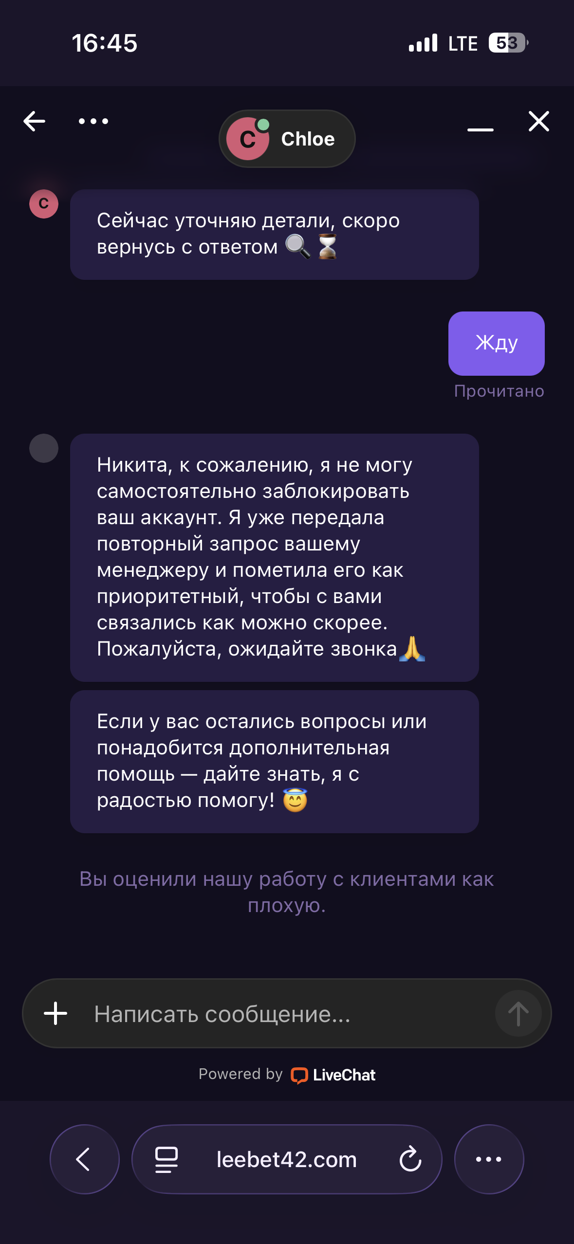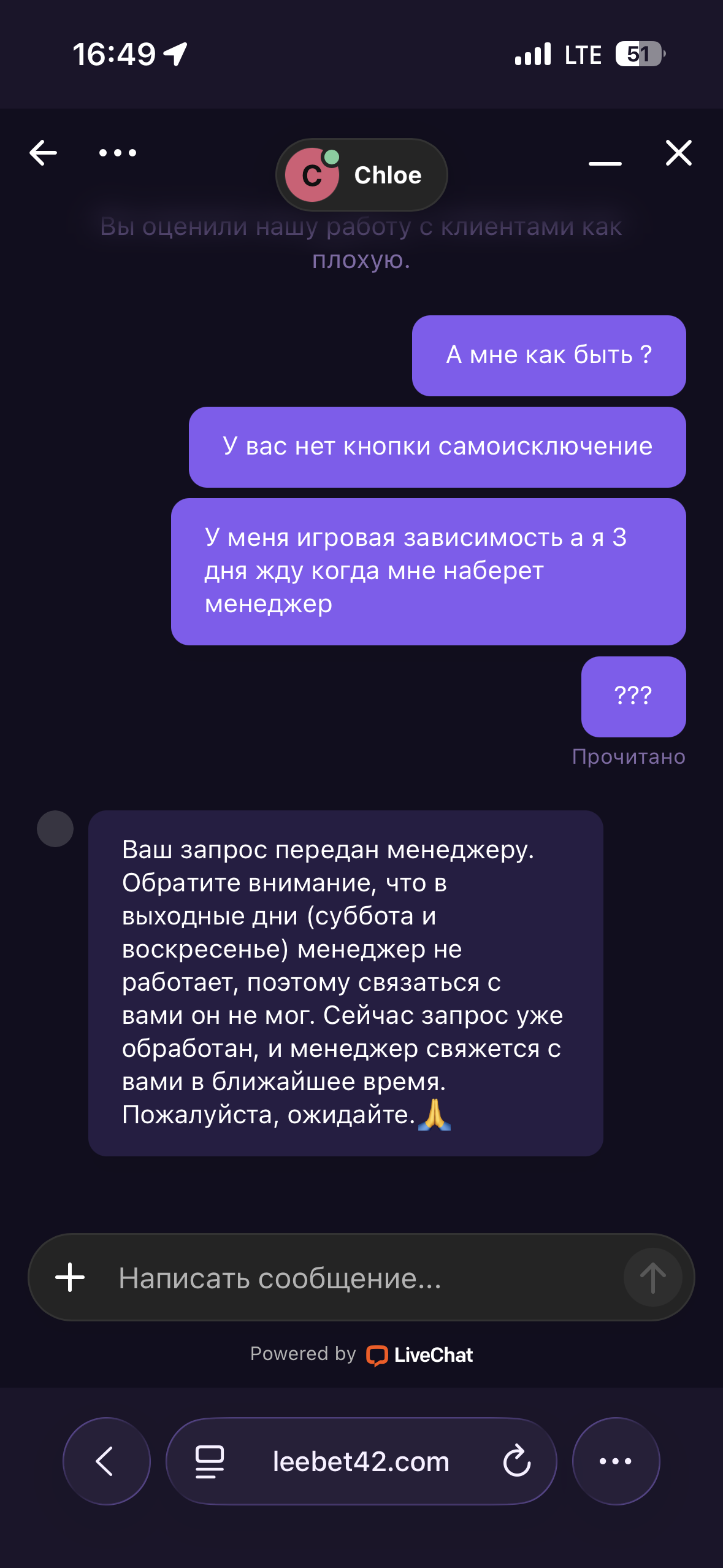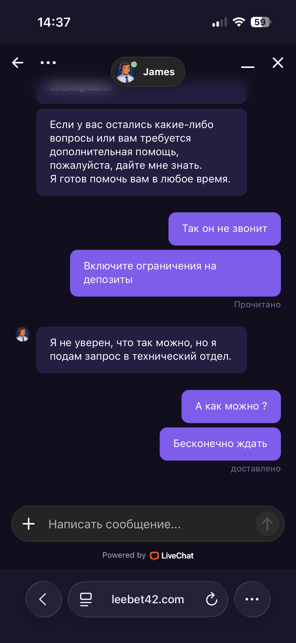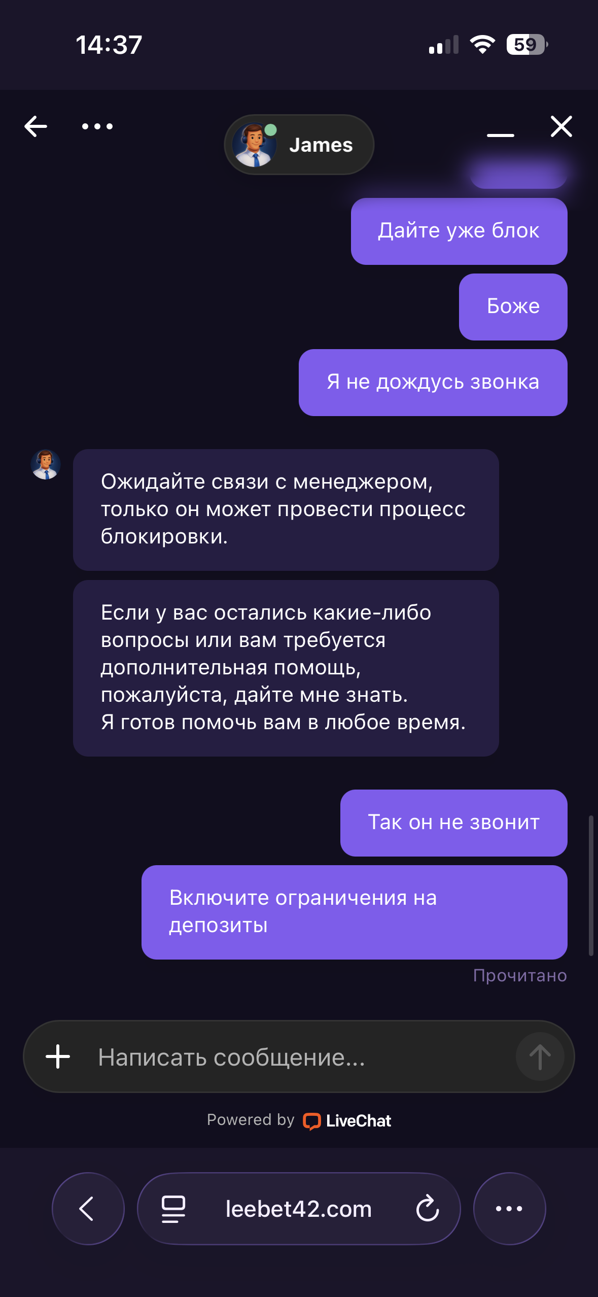 Прошу казино либет вернуть мои средства в размере 15тыс.рублей которые были проиграны это лишь малая часть которую я прошу, неоднократно просил блокировку аккаунта навсегда, и данный проект в принципе блокирует аккаунт якобы (навсегда) сам же и указывая это, мол вы согласны что аккаунт будет заблокирован навсегда и этот процесс невозвратим, но стоит всего написать в поддержку что хочешь снять блок, буквально пару секунд и тебя опять открывают доступ и вытягивают деньги в общем не об этом, буквально пару дней назад после небольшого выигрыша в 12тыс рублей и вывода их, я задепозитил обратно эти же деньги и даже больше, проиграл вообще все, написал в поддержку о том что хочу заблокировать аккаунт на что поддержка мне ответила что они не могут этого сделать так как я особенный игрок и у меня есть свой вип менеджер который мне с этим поможет на след.день звонит мне мой менеджер и говорит что ему передали якобы я начал просить в поддержке бонусы, я сказал что я просил блокировку аккаунта и мне сказали что только вы можете мне помочь, в общем от разговора ушли и он мне начислил 2 вип бонуса бездепозитных и сказал что в любое время могу обращаться к нему по любым вопросам, лудка меня сломала и я начал крутить эти бонусы, проиграв их я начал опять писать в поддержку что требую заблокировать меня, но они опять сказали что со мной свяжется вип менеджер, звонка не было день, за этот момент я опять успел проиграть свои деньги, написав опять в поддержку что я требую прям сейчас дать блок, они сказали ждать звонка, по факту я даже режим отдыха не могу включить без вип менеджера, по номеру с которого он мне звонил, не возможно дозвониться. В общем я считаю что казино либет ведет себя не уместно по отношению к людям которые просит их ограничить себя от казино, а лишь вытягивают и заманивают тебя дальше. Прошу казино Либет вернуть мне мои депозиты в размере 15тыс рублей(это очень маленькая часть из всех) и все же заблокировать мой аккаунт и если же вы даете людям блокировки навсегда то давайте их навсегда а не снимайте их при первой просьбе лудомана.