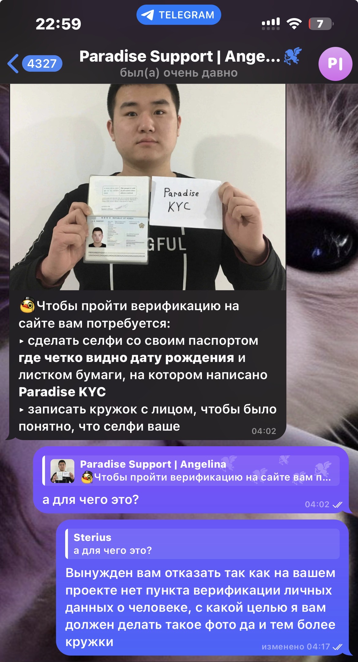так же хочу подметить, что у владельца данного проекта, есть еще один проект Horizon, на котором у меня тоже блокировка и поддержка у него одна и та же что с парадайсом нажимаешь на поддержку а тебя перекидывает на поддержку парадайса