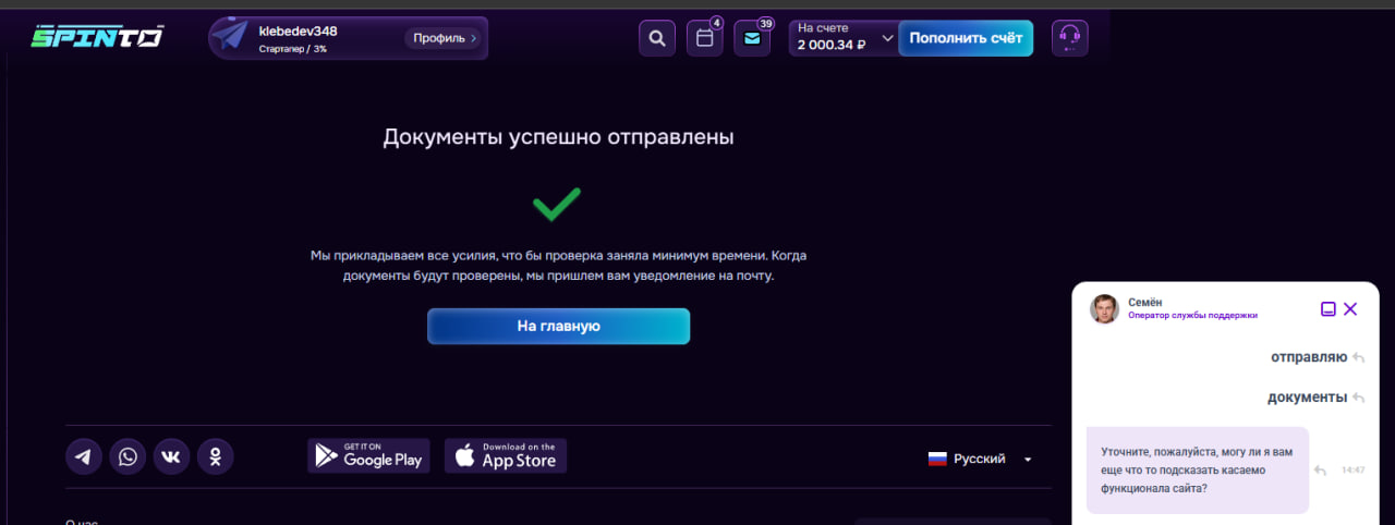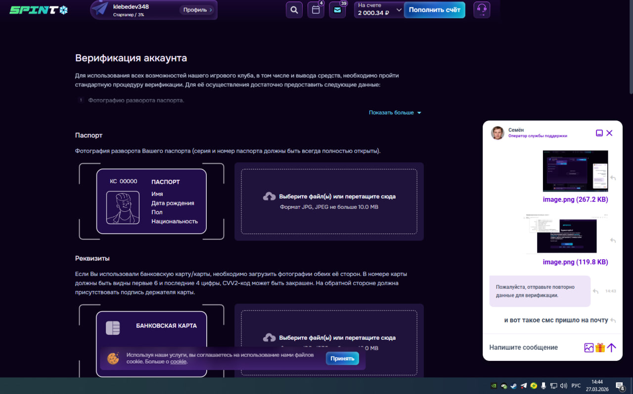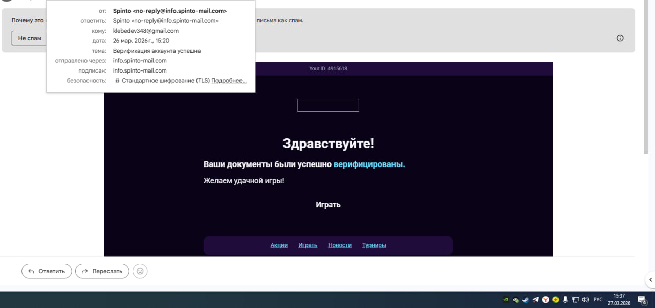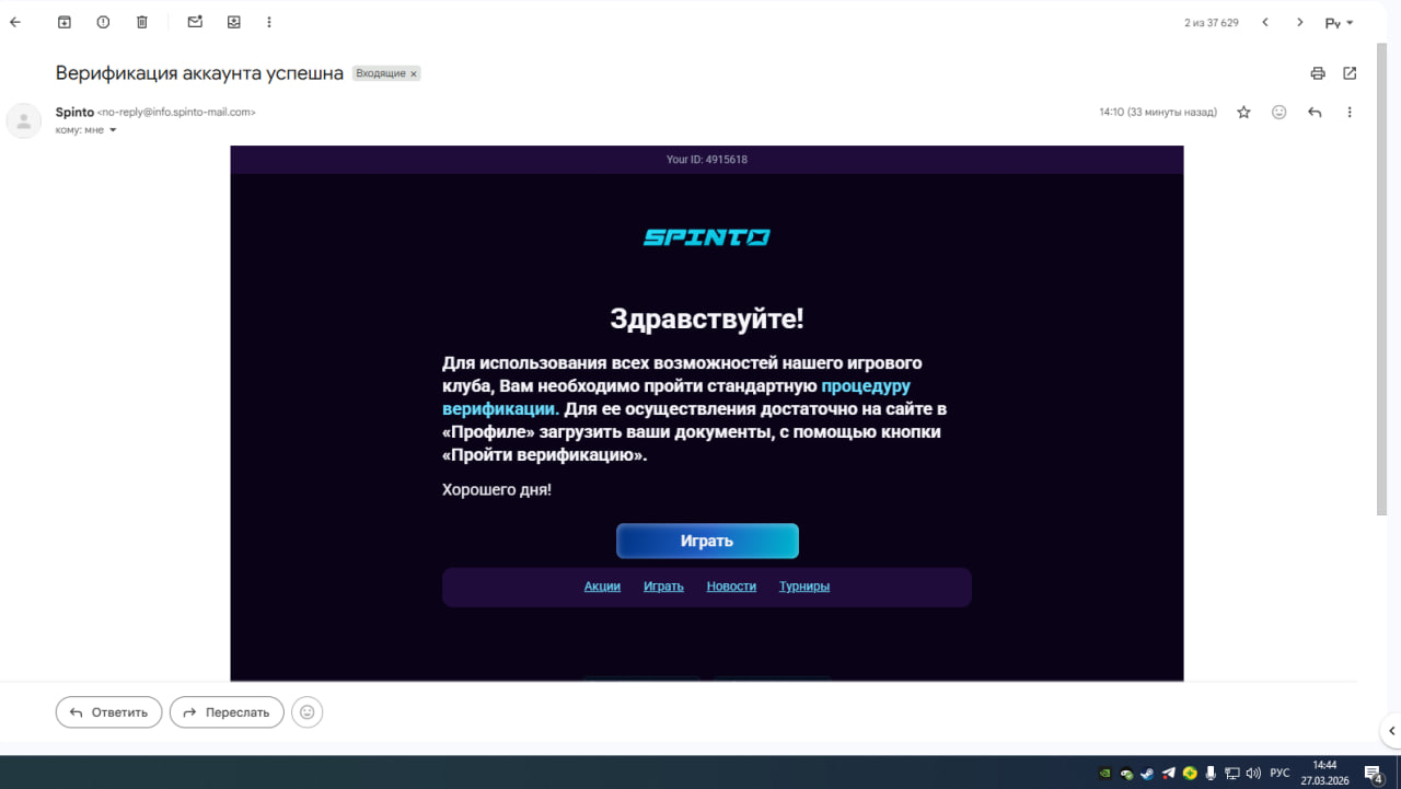Spinto Casino: с 18.03.2026 жду верификацию аккаунта и выплату на 25 USD