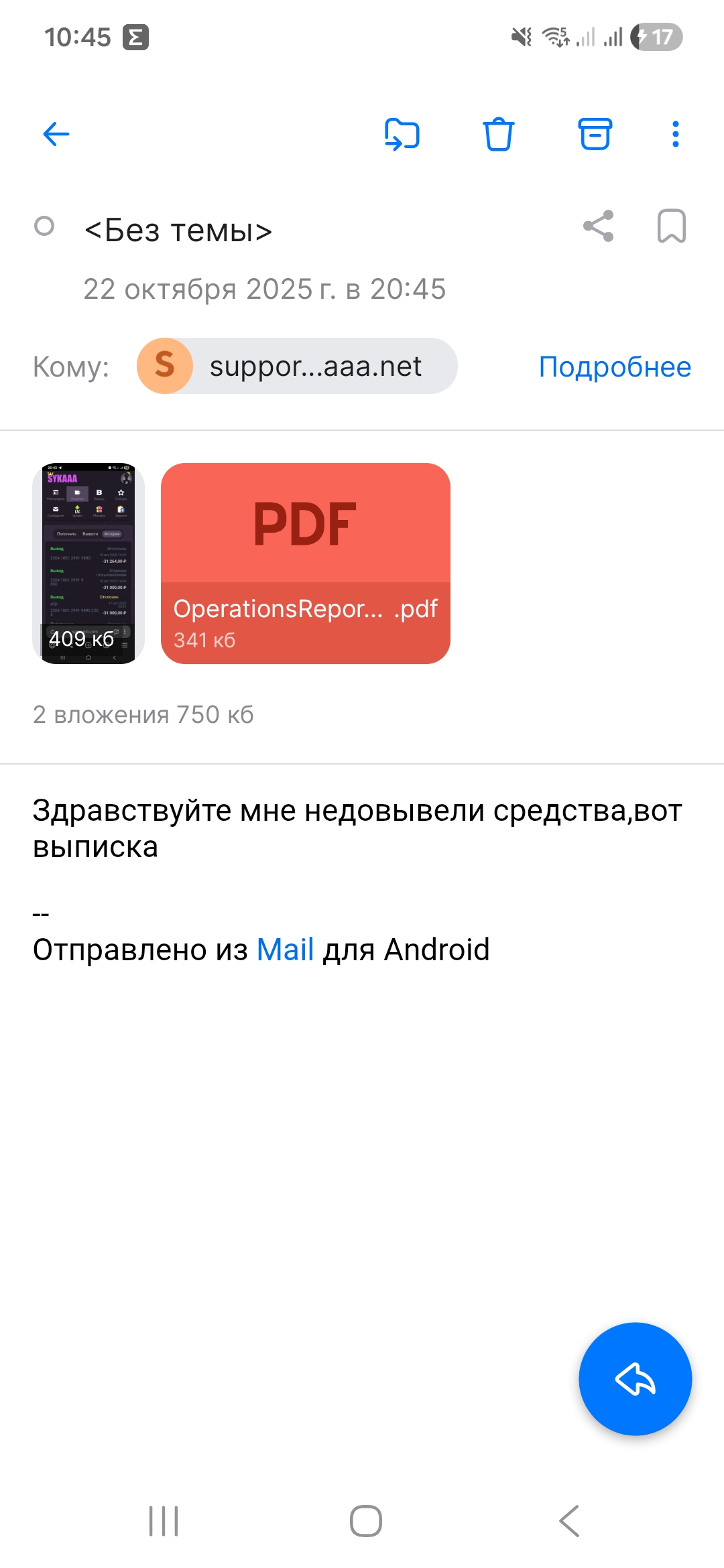Средства начислили, я снова поставил на вывод, как только выведут, сниму жалобу