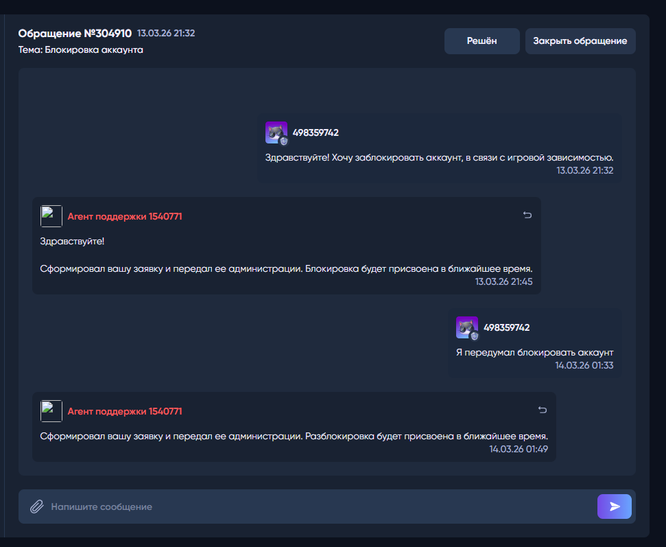 Есть нарушение со стороны проекта. Разблокировка после блокировки аккаунта по причине игровой зависимости.