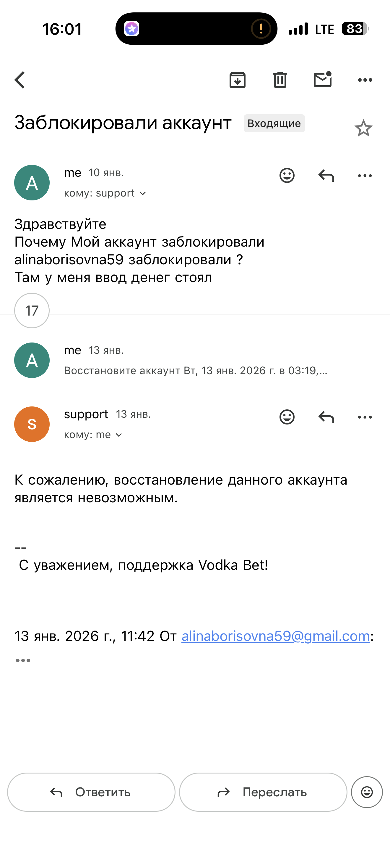 еще раз объясню :Я признаю техническое нарушение правил по созданию дублирующего аккаунта. В связи с этим я согласна на полное аннулирование всех бонусных начислений и вейджера. Однако я требую выплаты прибыли, полученной в результате ставок на мои реальные деньги(депозит 2 000р.). Удержание чистой прибыли от личных средств противоречит принципам лицензии Curacao (Mamba Edge B.V.).