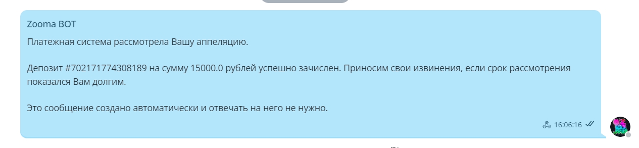 24.03.26 переводом по СБП в Челябинвестбанке перевела корректную сумму, на корректный номер в корректный банк, всё согласно заявке на пополнение, которую отобразил сайт zooma, сумма депозита — 15000 рублей. Депозит до сих пор, по состоянию на 25.03.26, не зачислен. Сначала я предоставила чек по операции, платёжная система в ответ запросила выписку по счёту. В Челябинвестбанке невозможно сформировать выписку по счету самостоятельно в приложении или интернет-банке, поэтому я запросила выписку через поддержку банка, и мне её приложили в личный кабинет в формате pdf с печатью Банка и подписью сотрудника, это скан-копия, завизированная самим Банком. Я направила эту информацию в поддержку zooma 25.03 в районе 18 вечера. Был создан повторный запрос в платежную систему и снова ответ, что депозит не может быть зачислен, так как причина: fake proof (ложные доказательства). Поддержка запросила у меня видеосъёмку, как я вхожу в приложение, открываю данную транзакцию, открываю по ней чек и т.д., я это предоставила. Сегодня, когда я снова написала в поддержку сама, у меня запросили выписку из Банка в формате pdf, только сформированную электронно — я пояснила, что в Банке такая функция отсутствует, приложила скрин переписки в приложении Банка о выписке и их ответ, в какой раздел мне её вложили, также прислала скрин раздела, в которой лежит эта же самая выписка до момента скачивания. В поддержке снова отправили запрос в платежную систему.