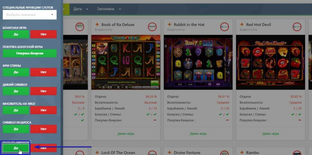 Также работает поиск и в разделе с демо-слотами. Фильтр отображается в подкатегории игр. Для того, чтобы найти слот с риск-игрой надо нажать только одну кнопку и сформируется список с соответствующим софтом.