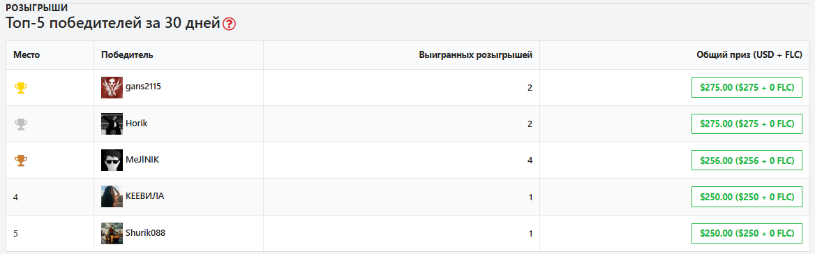@gans2115 Видать, фортуна не на твоей стороне пока) Я вон два месяца играю и тоже ничего, а кому-то фартит, блин) Чел 28 февраля зарегался и уже 4 выигрыша:))) Эму прям уж очень фартит) Бронзовый победитель!