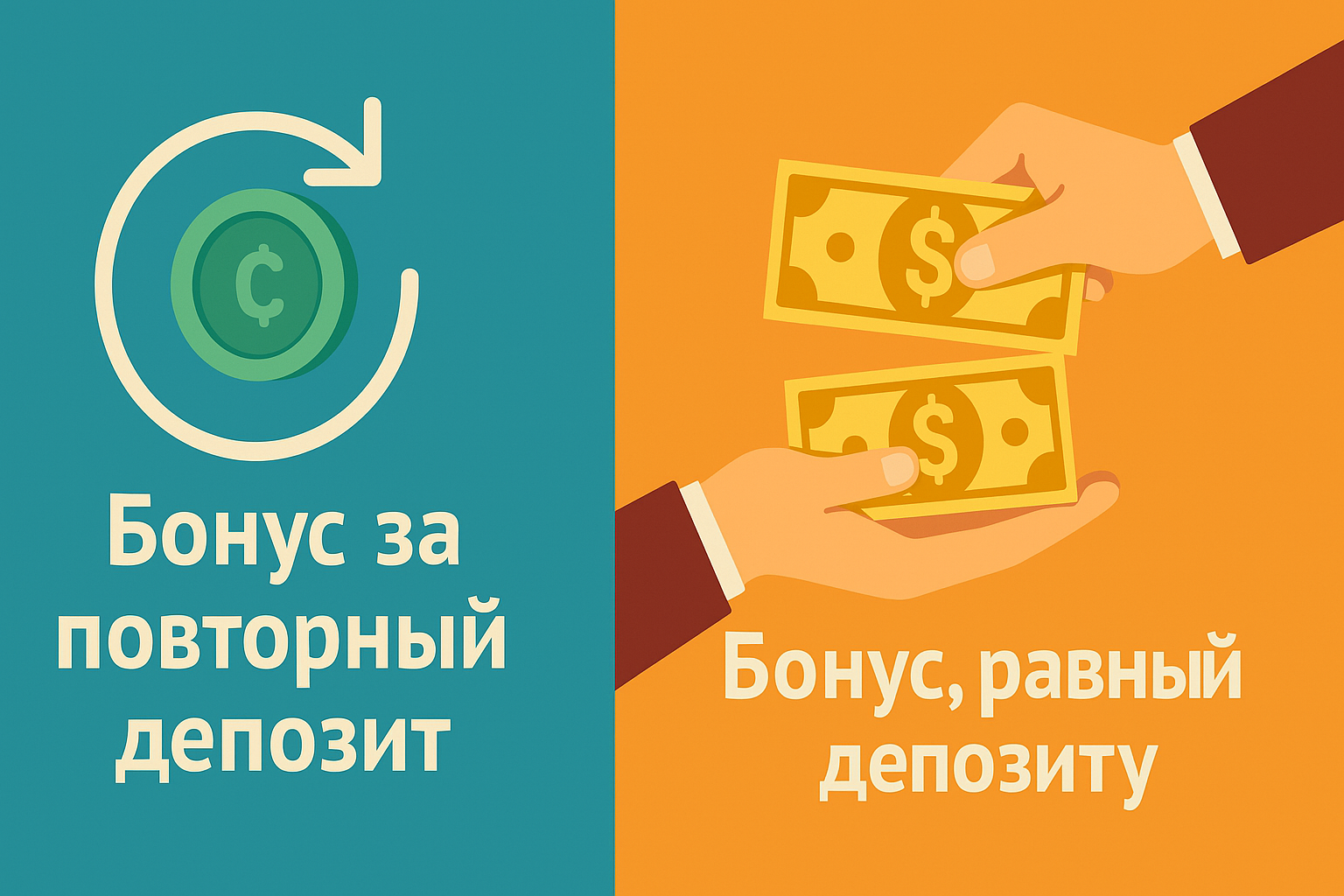 «Получите 50% бонус за повторный депозит каждую пятницу!» - Match-бонус → Бонус на депозит или Бонус, равный депозиту (иногда используют выражение «100% бонус на депозит»).
