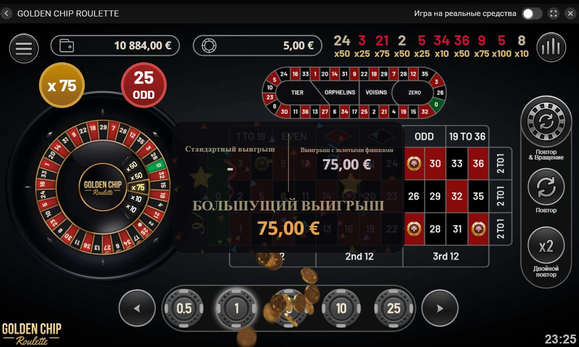 Искал эту рулетку, наконец нашел, сделал пять ставок по 1 ед, выпла множитель х75 а шарик на 25 где была одна из ставок)