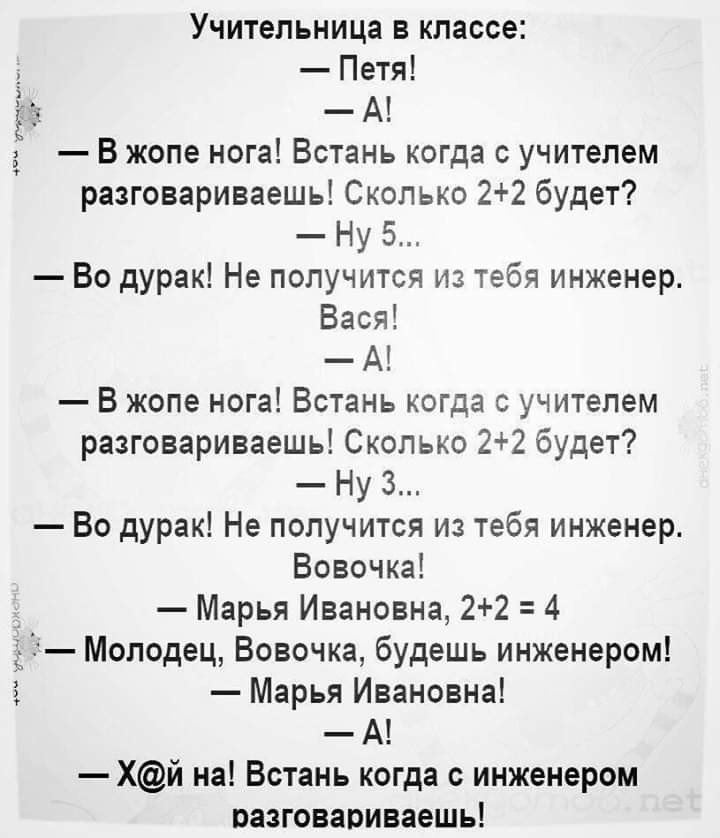 — Мадам, я внимательно вас изучил и пришел к выводу что стерва, дура и ведьма даже не ложились, а ангел и принцесса вооЩе не спят, они давно сдохли. 😎