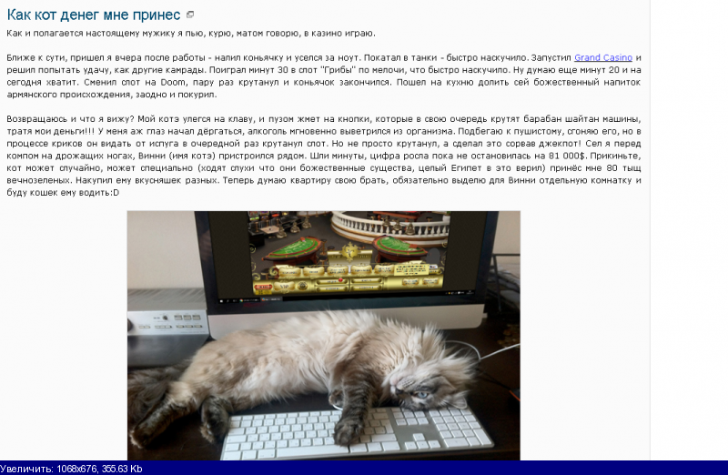 А как-то. какое-то казино. говорило — НЕ ПУСКАЙТЕ СВОИХ КОТОВ ИГРАТЬ — видимо то казино чето знало. Не помню че за казино.На форуме где-то про это казино Иван писал.